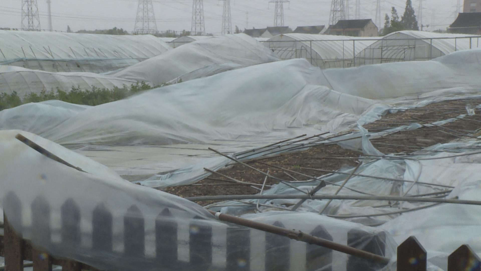 下午一点半左右,记者走进位于南桥镇华严村的上海一帆蔬果专业合作社。在强风中,即使是已经加固过的蔬菜大棚也出现了不同程度的晃动,合作社农户们正忙着清理现场、加固大棚、运送吹落破损的遮阳网。100多亩蔬菜地中,有15个蔬菜大棚都被吹塌,整个钢架结构都倒在田地里,塑料膜随风飘荡,多亩蔬菜直接暴露在风雨中。