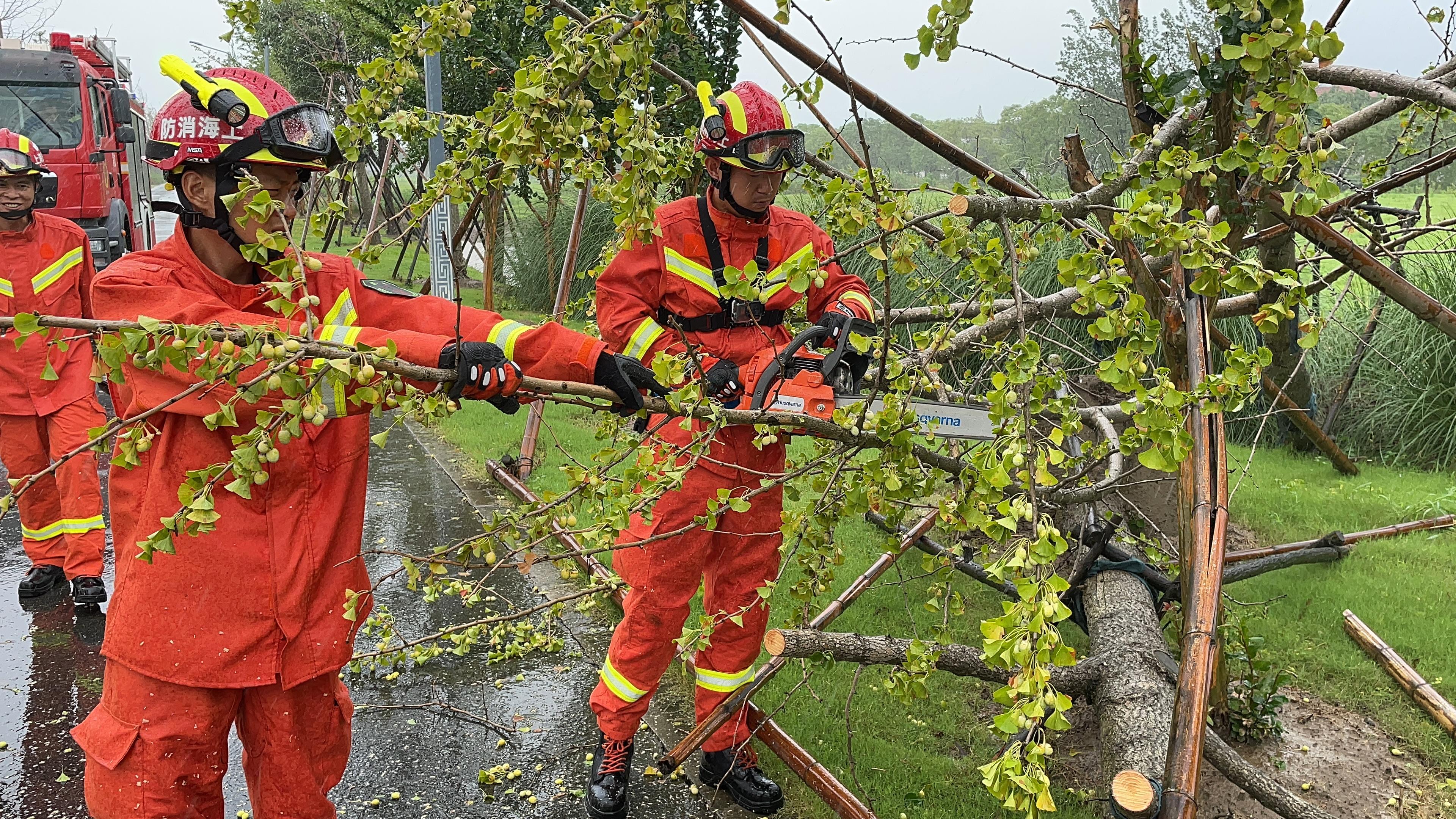 无独有偶。随着台风“烟花” 10级风圈逼近,奉贤、金山等地区的风势、雨势逐渐增强,局部地区瞬时强风达10级,仅上午25日6时至11时,奉贤消防已累计接警出动51起,高空排险37起,其中以室外热水器、广告牌、遮阳雨篷、晾衣杆居多,此外还有多处道路行道树被强风吹断。