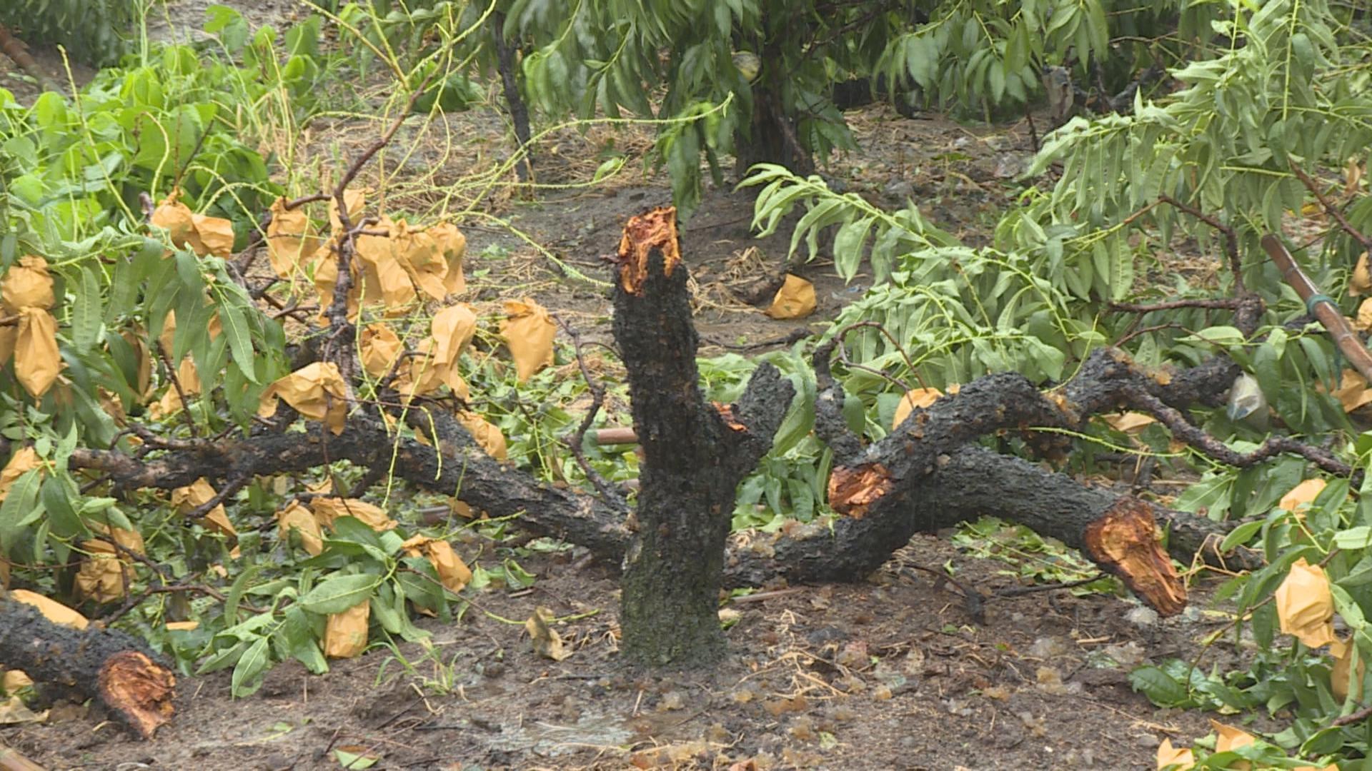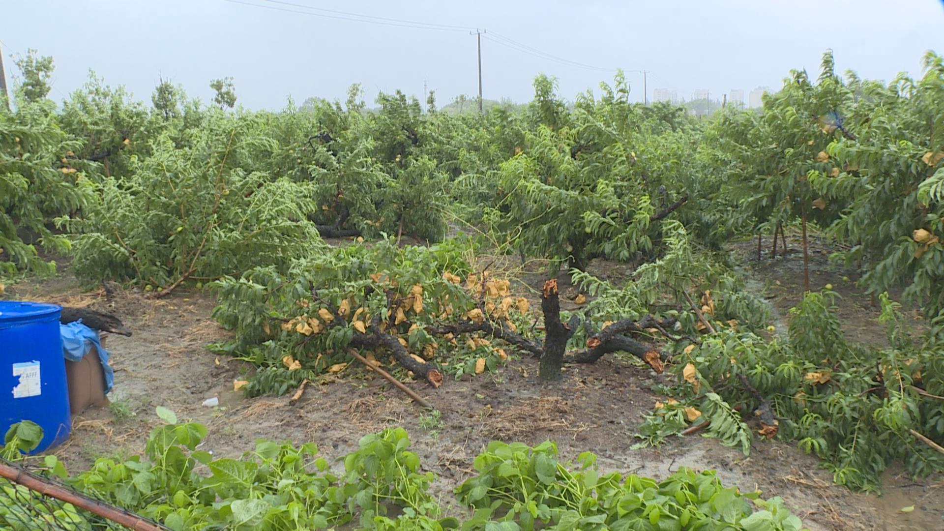 这场比往年来得早的台风,也影响到了即将在10余天后成熟上市的奉贤锦绣黄桃。在青村镇解放村的一处果园内,由于强风侵袭,几棵15年树龄的老桃树被拦腰吹断,也有不少略显青涩的果子被吹落在地。