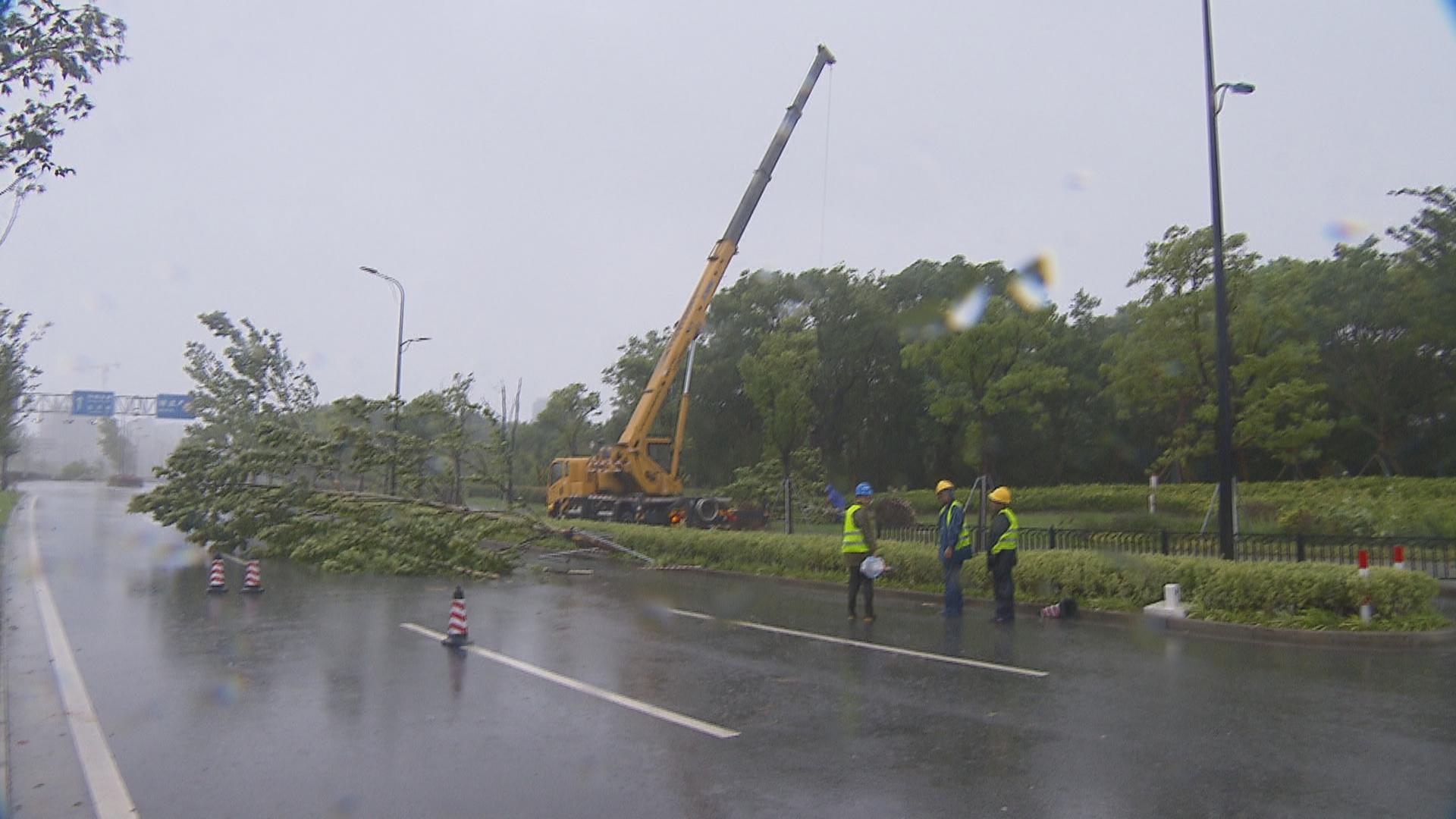 下午一点左右,记者在南桥城区看到,南奉公路青峰时代广场前有一米多的道路隔离带被风刮倒,在航南公路,有一段长达百米的隔离带也倒伏在桥面上。此外,新城地面较为空旷区域的树木,受灾较严重。记者看到,位于航南路、望园路交叉口的多棵树木倒伏在路边,抢险队伍已经抵达现场进行处理。