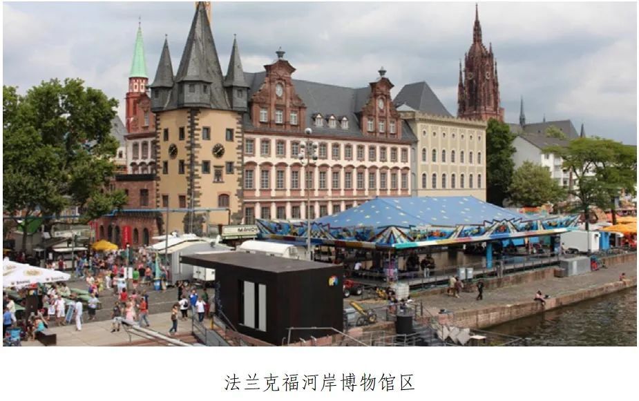 由单一功能区更多地向文化为特色的综合功能区转型,面向的使用者群体从观赏者逐渐扩大到游客、市民、就业人群等,满足24小时的使用需求,使之更好地融入城市。如法兰克福河岸博物馆区,既有大型的博物馆,如应用艺术博物馆、现代艺术博物馆、犹太博物馆、卡里卡托漫画馆、施泰德艺术馆等;又有小型艺术场馆,如大教堂周边的画廊、小型博物馆等,同时周边配套有法兰克福中央火车站、并设置了许多酒店与餐饮、东北侧有许多大型购物中心和专卖店,南侧为连片的居住区。