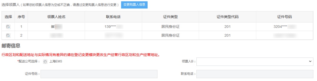 2. 选择领票人,如需选择第二名领票人,请选择领票人B信息。若领票人信息带出不完整或错误请至发票票种核定进行变更,并在“办税人员实名信息采集”模块,对办税人员进行实名认证。