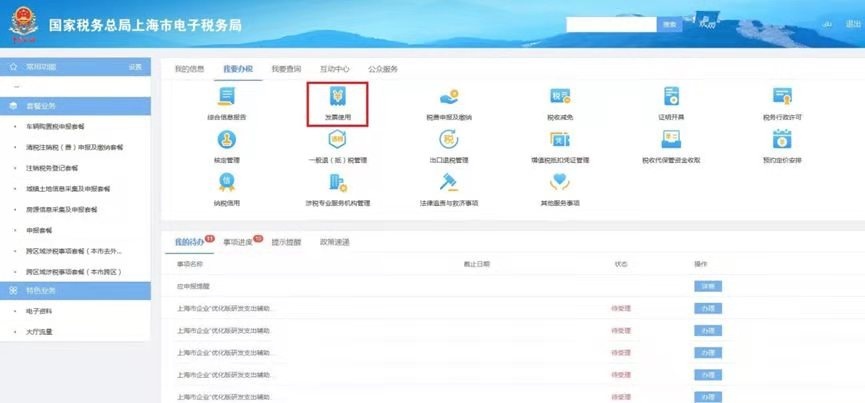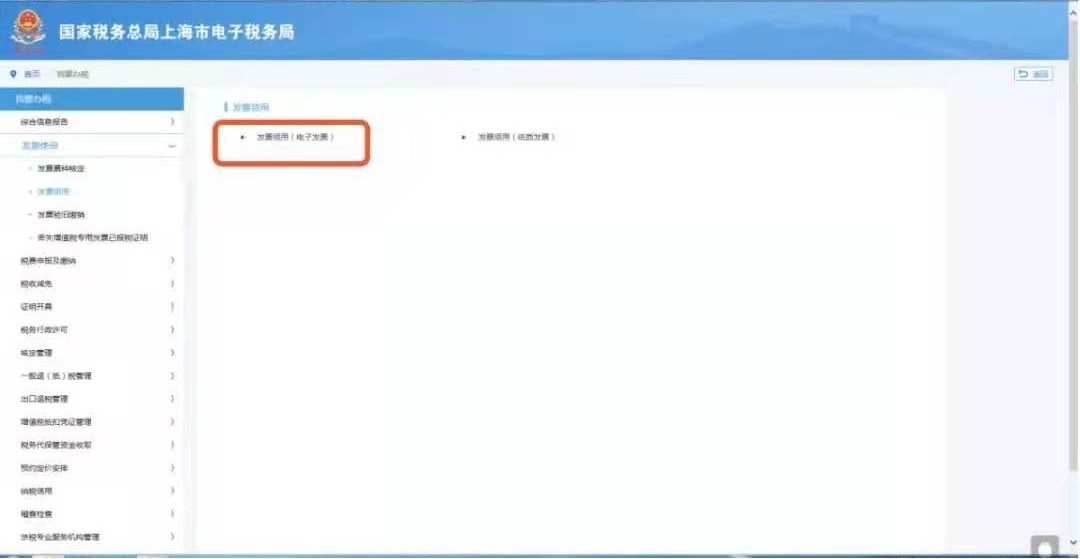 登录电子税务局,点击首页菜单栏中“我要办税”中的“发票使用”菜单,点击“发票领用”栏中的“发票领用(电子发票)【创新版】”进入办理页面。