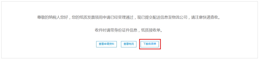 纳税人可点击该领票记录后的“查看”,点击“下载收票单”按钮打印专业配送收票单。配送收票单加盖公章或发票专用章,核对并签收发票后返回给物流公司。