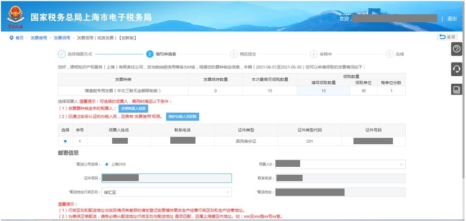 1.配送地址和行政区划为税务登记中生产经营地址和行政区划,如需变更,请至“变更登记”模块进行变更。请确保配送地址和行政区划无误,否则会导致无法正常配送和后续发票网上申领。