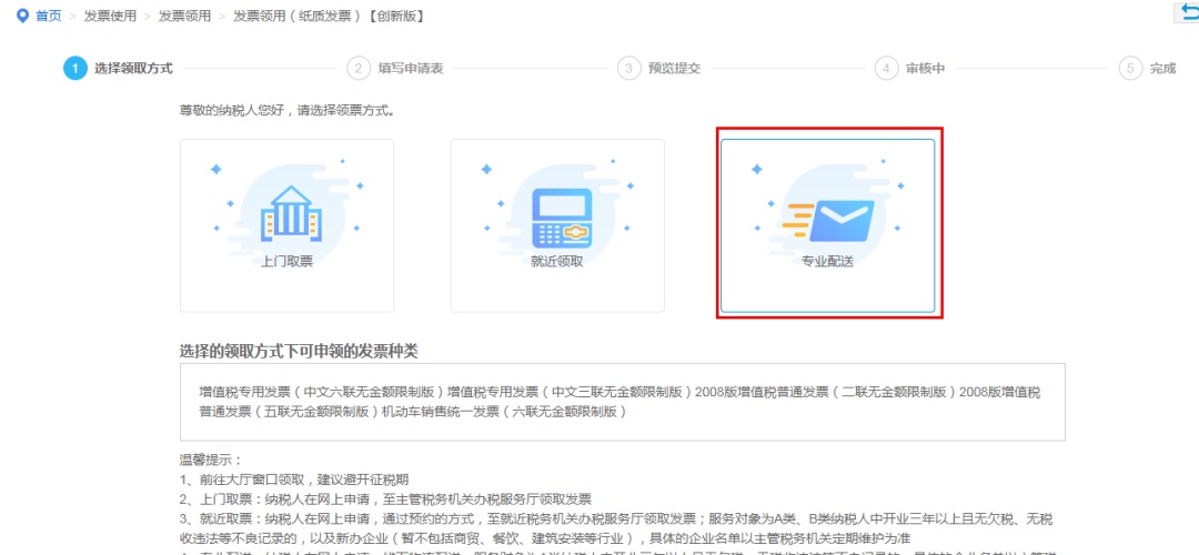 申税小微,我们是新办企业,票种核定时我们申请了10份电子专用发票加15份增值税纸质专票,听说15份增值税纸质专票可以选择专业配送,台风天不用出门就能办,真是太方便了!如何操作你能告诉我吗?