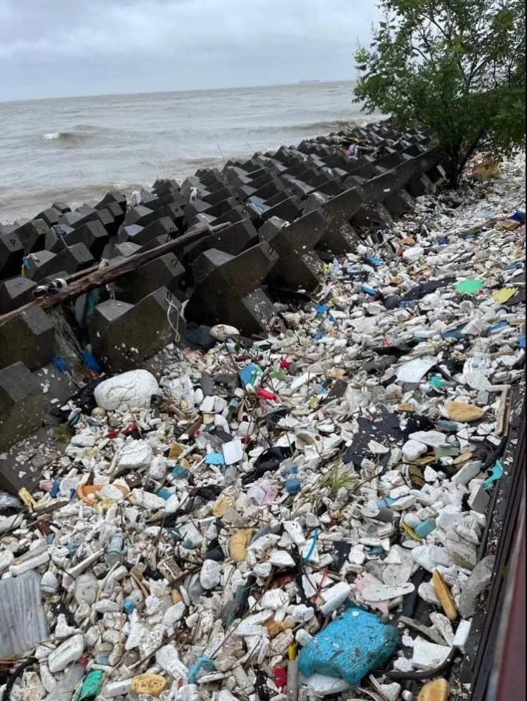 滨江森林公园北临长江口,西临黄浦江,位于黄浦江、长江和东海三水交汇处。公园沿江有一条2公里长的堤岸,建有三处亲水平台,本是游客观赏“三水并流”的好去处。台风“烟花”过后,一堆“大自然的回礼”让美丽堤岸一夜之间变成了垃圾堆场。成片成堆的垃圾中,大部分是白色泡沫塑料,还有很多矿泉水瓶、饮料瓶,以及塑料袋、酒瓶等各种垃圾,而这些垃圾都是人类扔的。