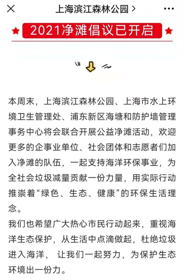 刚刚,上海滨江森林公园发出净滩倡议,将于7月31日(周六)组织开展公益净滩活动,欢迎社会单位、团体通过开展志愿服务。有时间的小伙伴可以用净滩的方式让平常的周末变得不平常,用自己的绵薄之力,保护海洋、保护地球家园。观察君了解到,“上海滨江森林公园”微信公众号中刚刚上线了报名链接,想要参与的市民可以点击二维码报名。