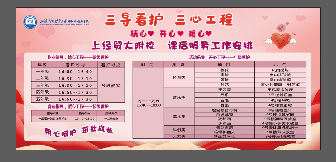 开展小学生校内课后服务是促进孩子们健康成长的重要举措,是顺应民生需求、学校主动承担社会责任的体现。根据市教委相关文件以及松江区“云间‘三心’工程”方案,结合防疫防控要求,上经贸大附校全面组织开展“三导看护•三心工程”课后服务工作,传递教育温情,呵护孩子成长。