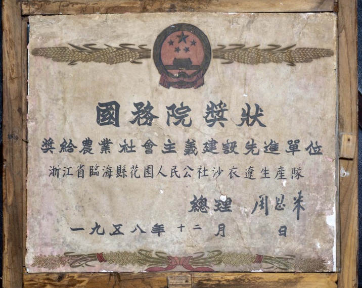 在浙江省临海市尤溪镇沙衣辽村办公室,一张发黄褪色的奖状挂在醒目位置,被精心地保管着。这张奖状由国务院颁发,落款为“总理”和手写体“周恩来”,它承载着一段光荣的历史。