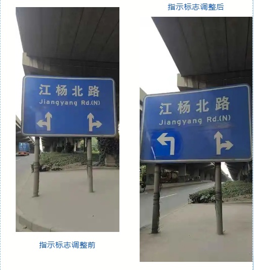 通过调整泰和路东向西主线与辅道分流处的车道指示标志,提前指引进入主线与辅道车辆按所需行驶方向各行其道,减少主线直行车流量,缓解S20江杨北路下匝道往主线汇入的车流冲突。