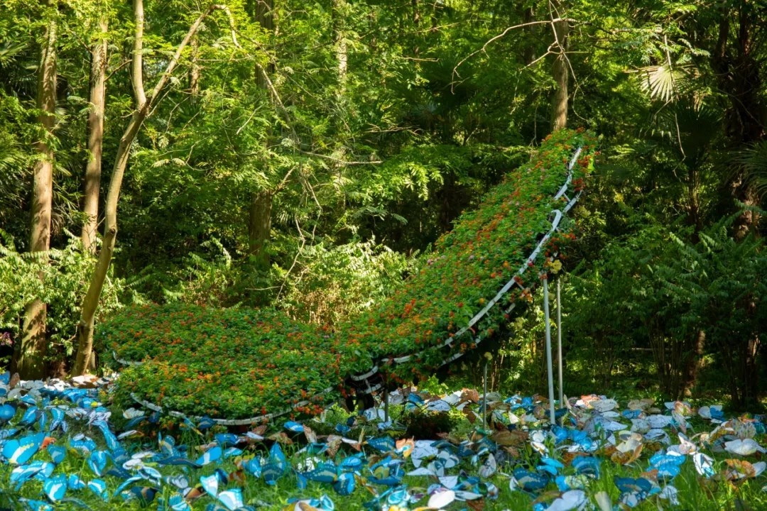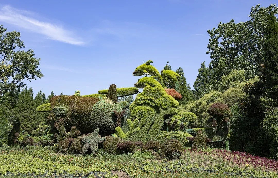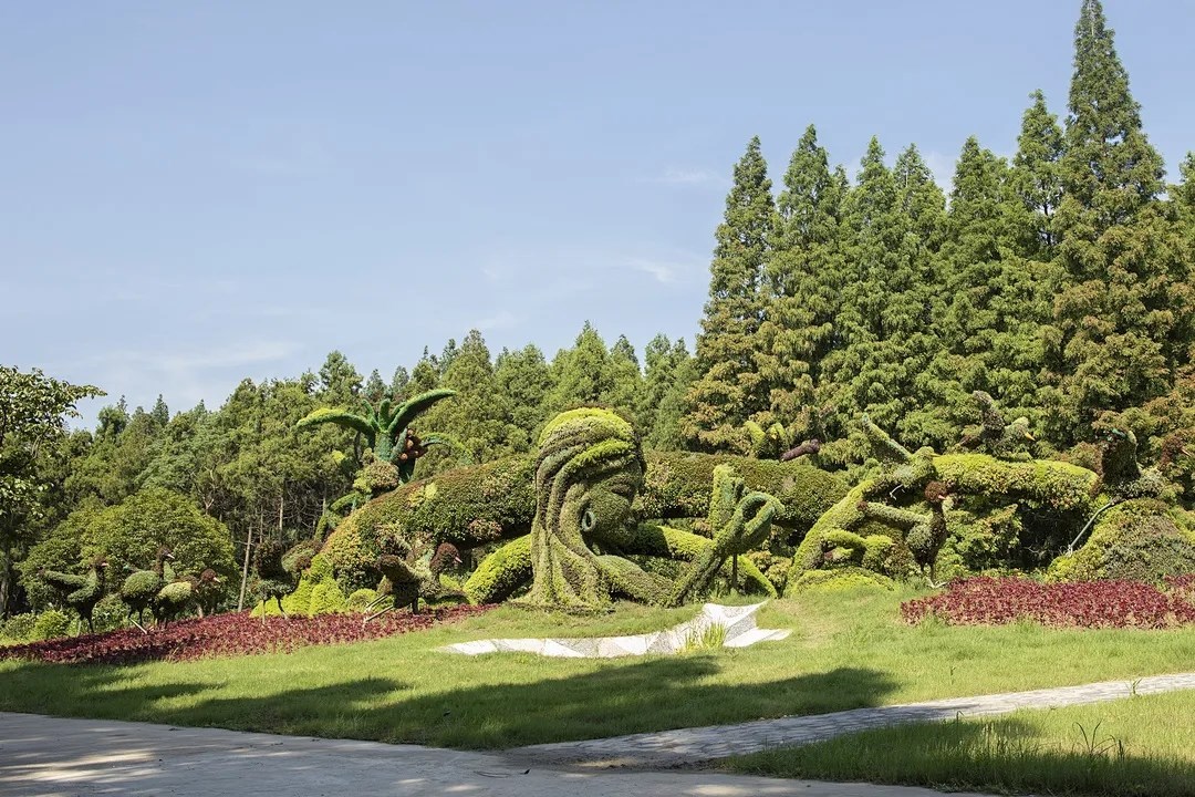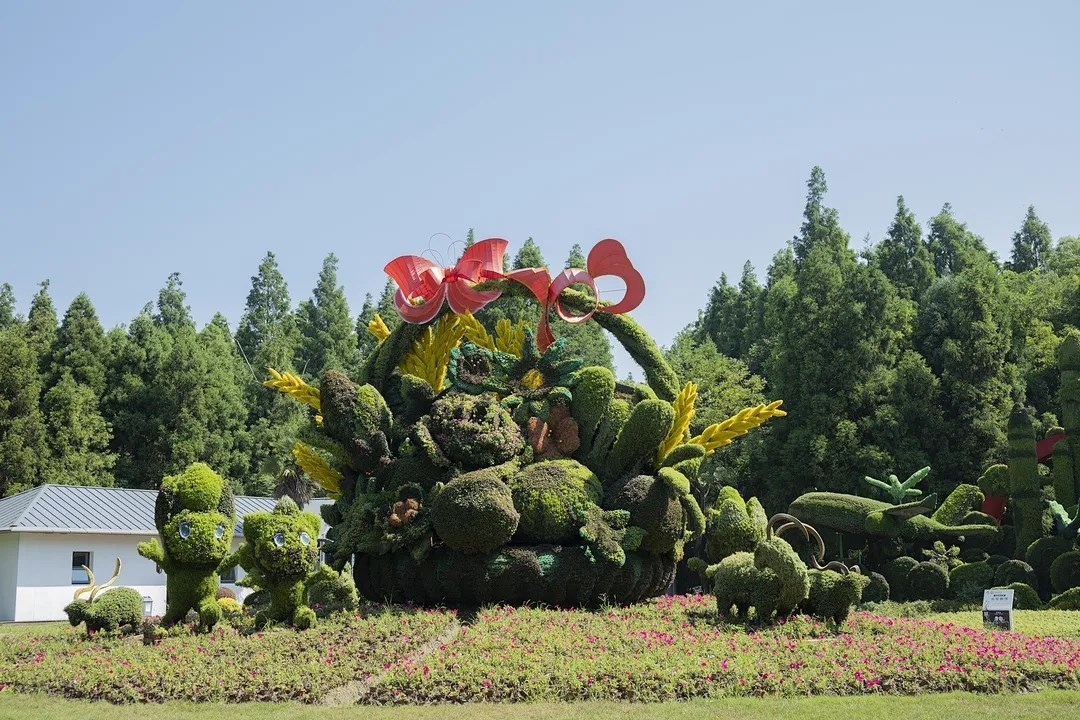 叠翠园位于水杉湖西岸,占地面积约1.1万平方米,是目前国内主题演绎最鲜明、群组表现规模最大、设计施工工艺最复杂、观众参与互动性最高,植物用材数量最多的绿雕展园。