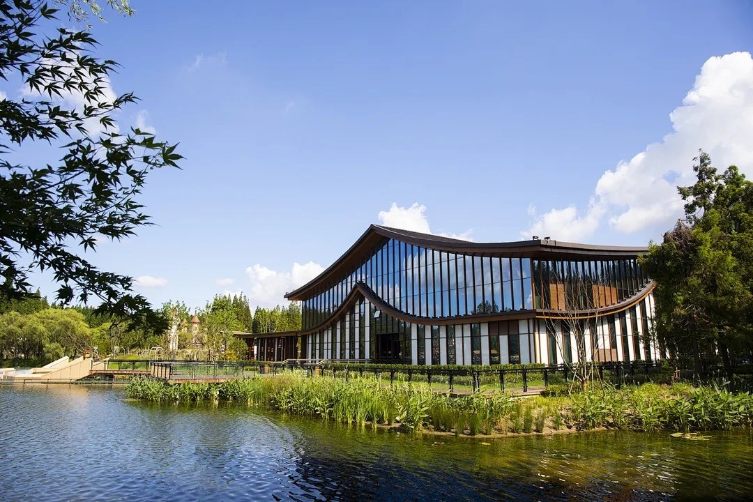 锦湖天地坐落于水杉湖畔,紫藤长廊东北侧。主体建筑面积5535平方米,是南园最大的单体建筑,也是集游客服务、餐饮休息、科普展示为一体的智能化管理服务中心,目前花博南园的主要餐饮供应点便在这里。