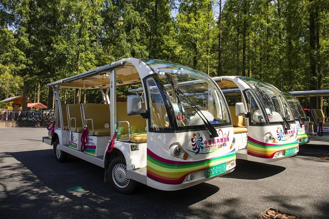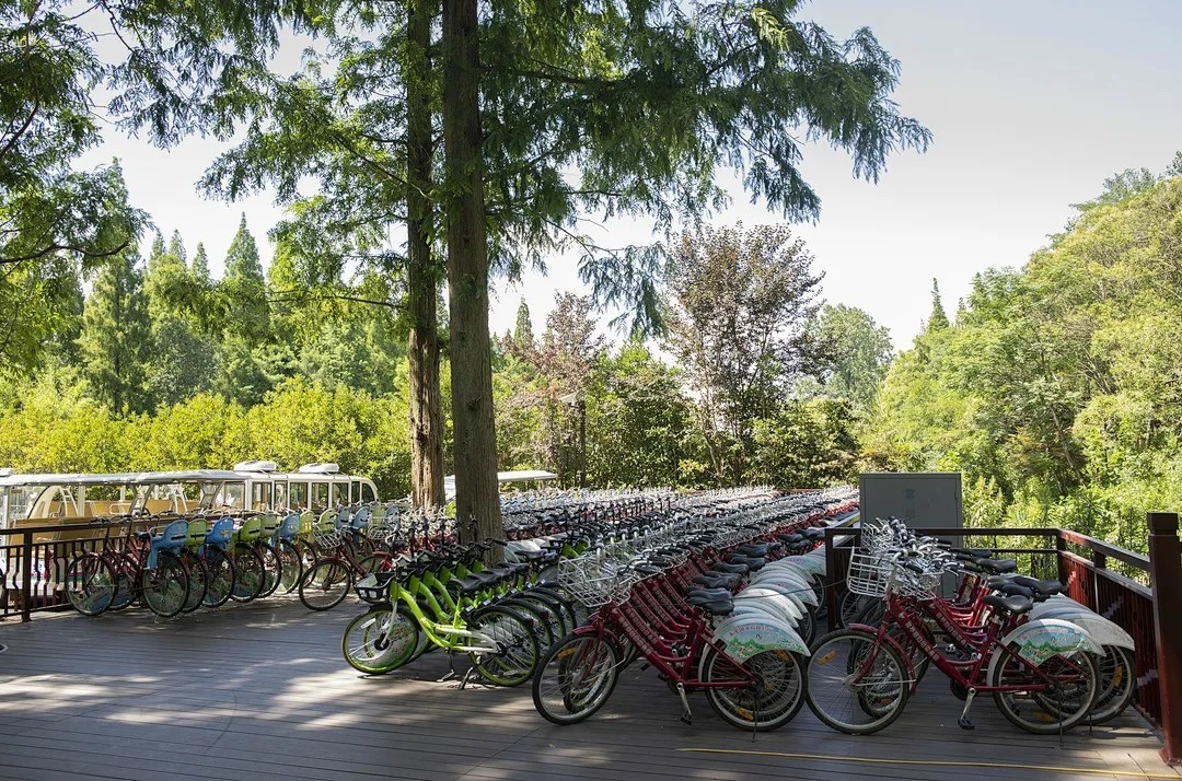 交通中心就在入口处不远,在这里你可以选择乘坐电瓶车、游览车,也可以租一辆自行车,在这占地5400亩的大花园里,来一场风一般的骑行。如果你选择乘坐游览车,则有不同的精品路线供你选择。