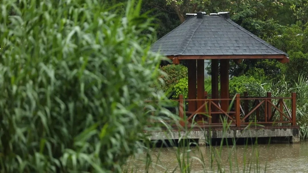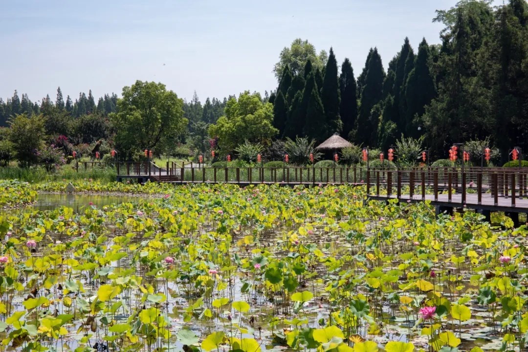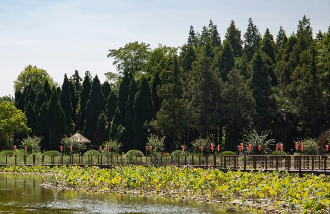 在这里的莫奈莲归区临近陆上展示区进行草花、荷花及水生植物栽植。同时配有木桥和木亭等景观元素,打造出静谧的景观展示区。