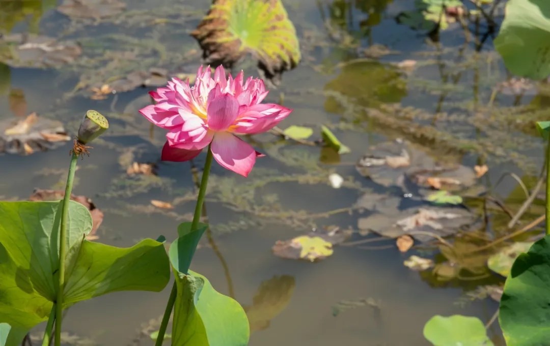 在华夏荷韵区(荷花荡),主要以王莲、精品荷花展示为主,结合现有水系,在南侧沿岸增设236米长,3米宽的水上栈道游览系统,在房车营地木平台处布置游船码头便于游客水中赏荷。