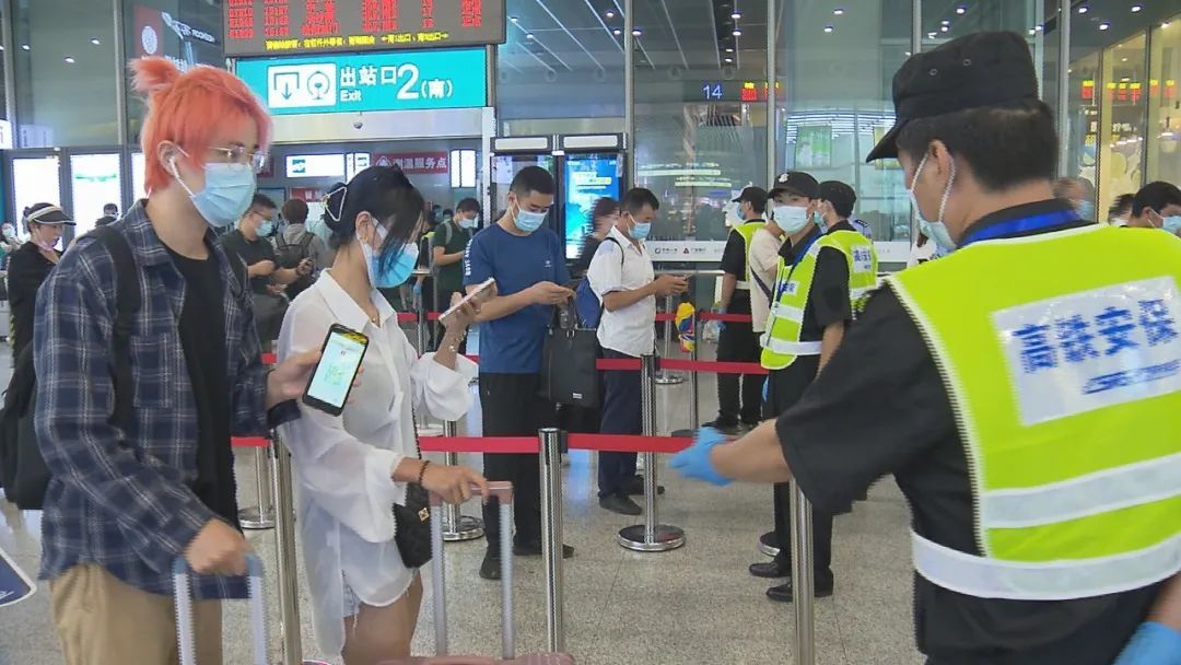 今天(7月29日)中午,记者来到虹桥火车站的南2出站口,现场一列刚刚途经南京抵达上海的列车进站,旅客正在接受闵行防控人员的逐一核验。