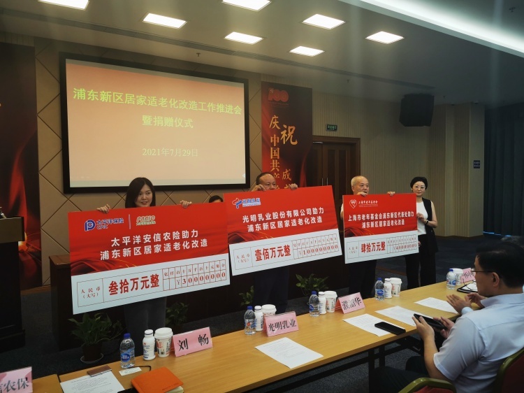 据悉,从本月开始,新区的适老化改造工作将全面覆盖36个街镇。会上,新区民政局部署了下阶段的适老化改造推进工作,并开展了市适老化改造服务平台工作培训。当天,光明乳业有限公司、太平洋安信保险公司和上海市老年基金会浦东分会共同捐赠170万元,用于新区部分睦邻点完善适老环境、添置适老设施,为农村老年人打造更安全、舒适的活动环境,也助力浦东适老化改造工作。
