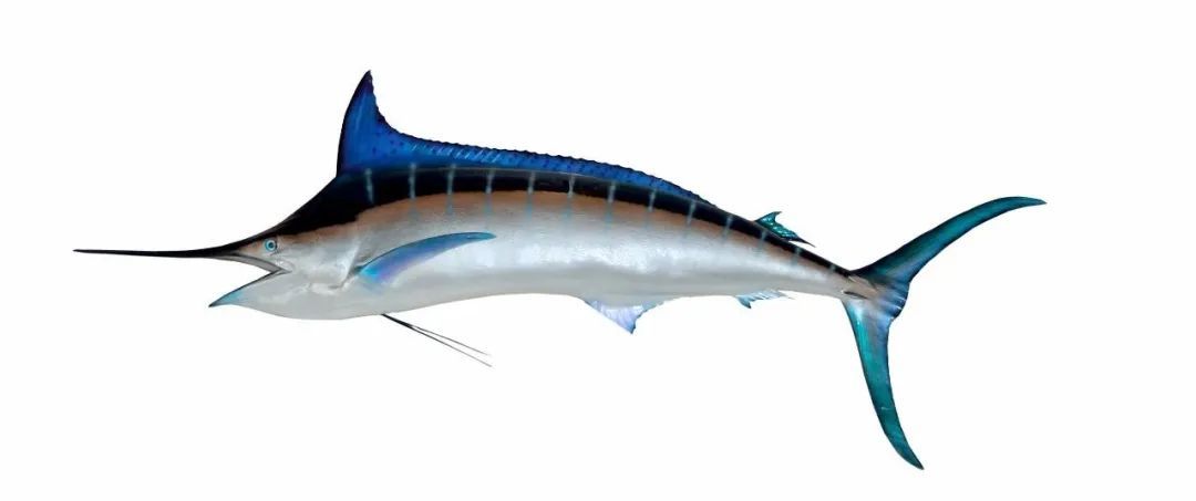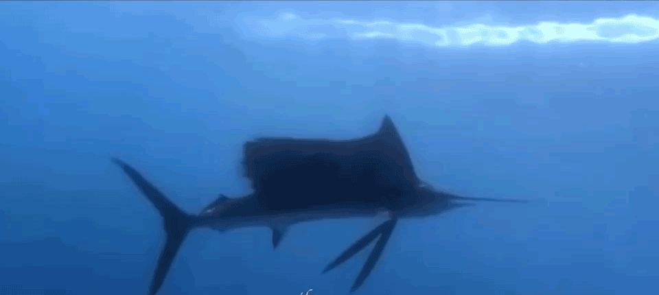 旗鱼快速游动时,会把大背鳍收起,藏于背部沟内,减少前进的阻力。此外,它们的尾柄特别细,肌肉发达,摆动起来非常有力,像发动机一样。这些构造,都是旗鱼称霸游泳界的秘诀。