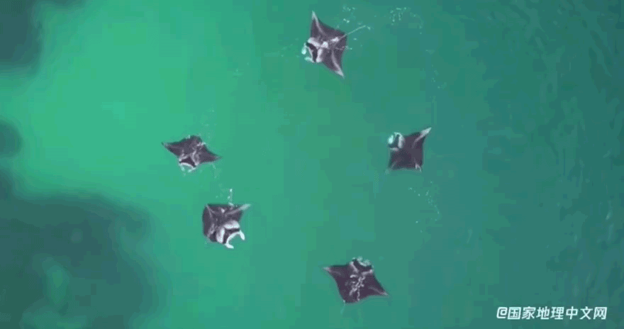 上图这段影像是Mark Merkley在夏威夷欧胡岛沿岸拍摄到的,画面中,5只蝠鲼组成一个团体,绕圈游动。海洋巨型动物基金会主任、国家地理探险家Andrea Marshall解释,这种围成一圈的行为是一种社交性进食,采取环形阵列不仅能够加强它们之间的社会联系,还可以帮助它们吃到更多的浮游生物。