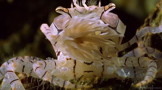 但加油并不是这种萌系小螃蟹的本意,它有自己的算盘。海葵的触手上布满了可以释放毒素的刺细胞,不仅可以黏住海水里面的悬浮物和浮游生物,还能依靠毒素捕捉一些小鱼,所以,海葵可是花纹细螯蟹的捕食利器。而且,海洋中许多生物都害怕海葵,挥舞海葵也可以用来自卫!