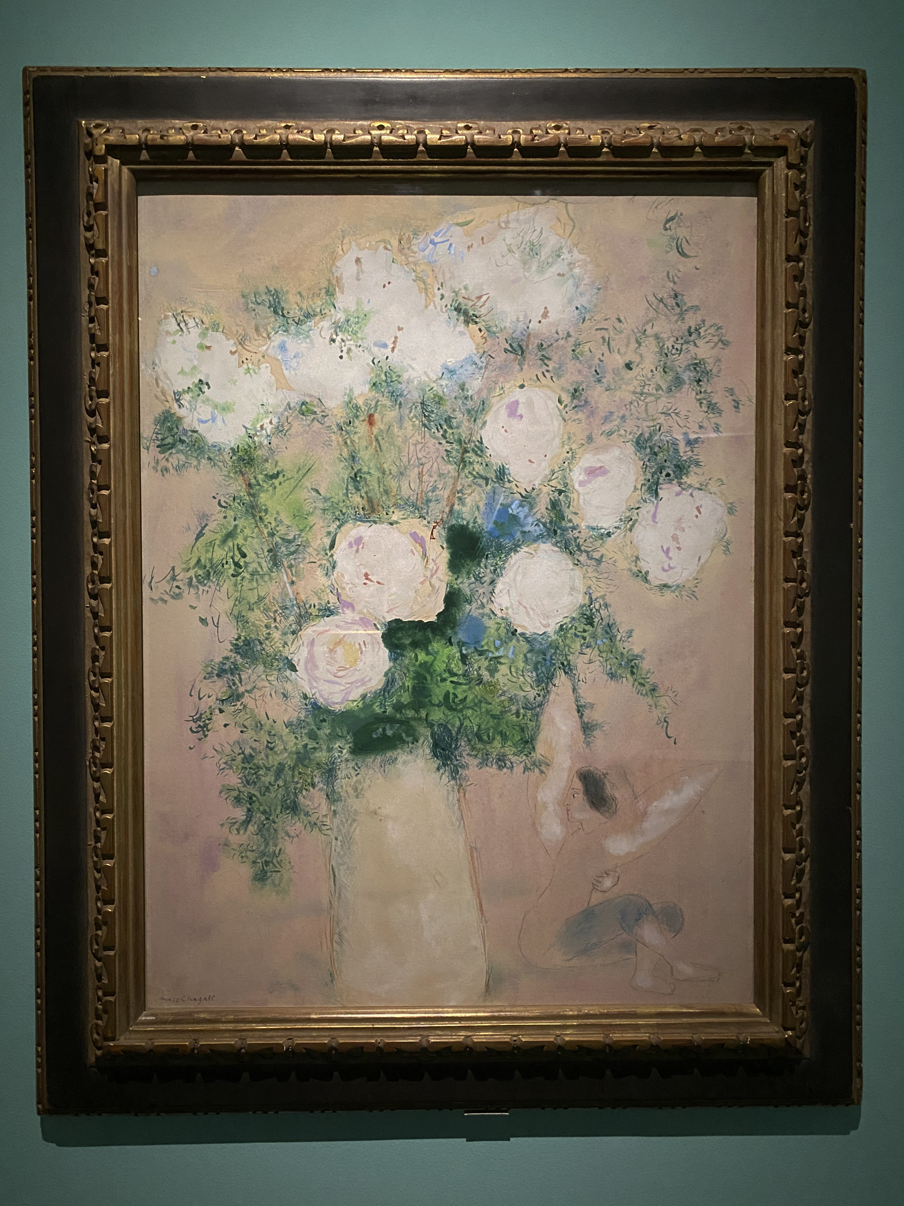 夏加尔的一生饱经战火纷乱,颠沛流离,花支撑着他走过艰难岁月,是他不可缺少的灵感源泉。此次展览展出了多幅夏加尔创作的花束作品,仔细观察会发现夏加尔对花朵枝叶的放大化的处理,在旁边的人物衬映下更像是一颗参天大树,明丽饱满的色彩让这些鲜花迸发出的生命激情,夏加尔用不同的花传递爱的信息,歌颂生命的美好。