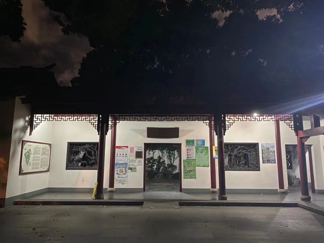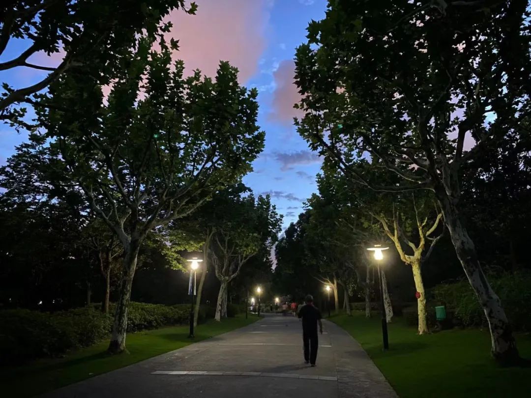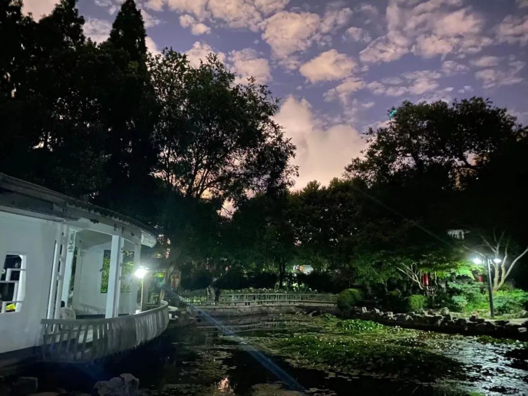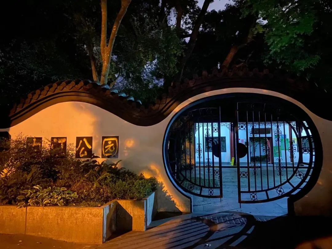 内江公园是杨浦小有名气的“古典风”公园。外院皂瓦白墙,方砖地坪,花窗宫灯,置山石盆景。落日余晖中,漫步园内,片刻宁静大可一人独享。