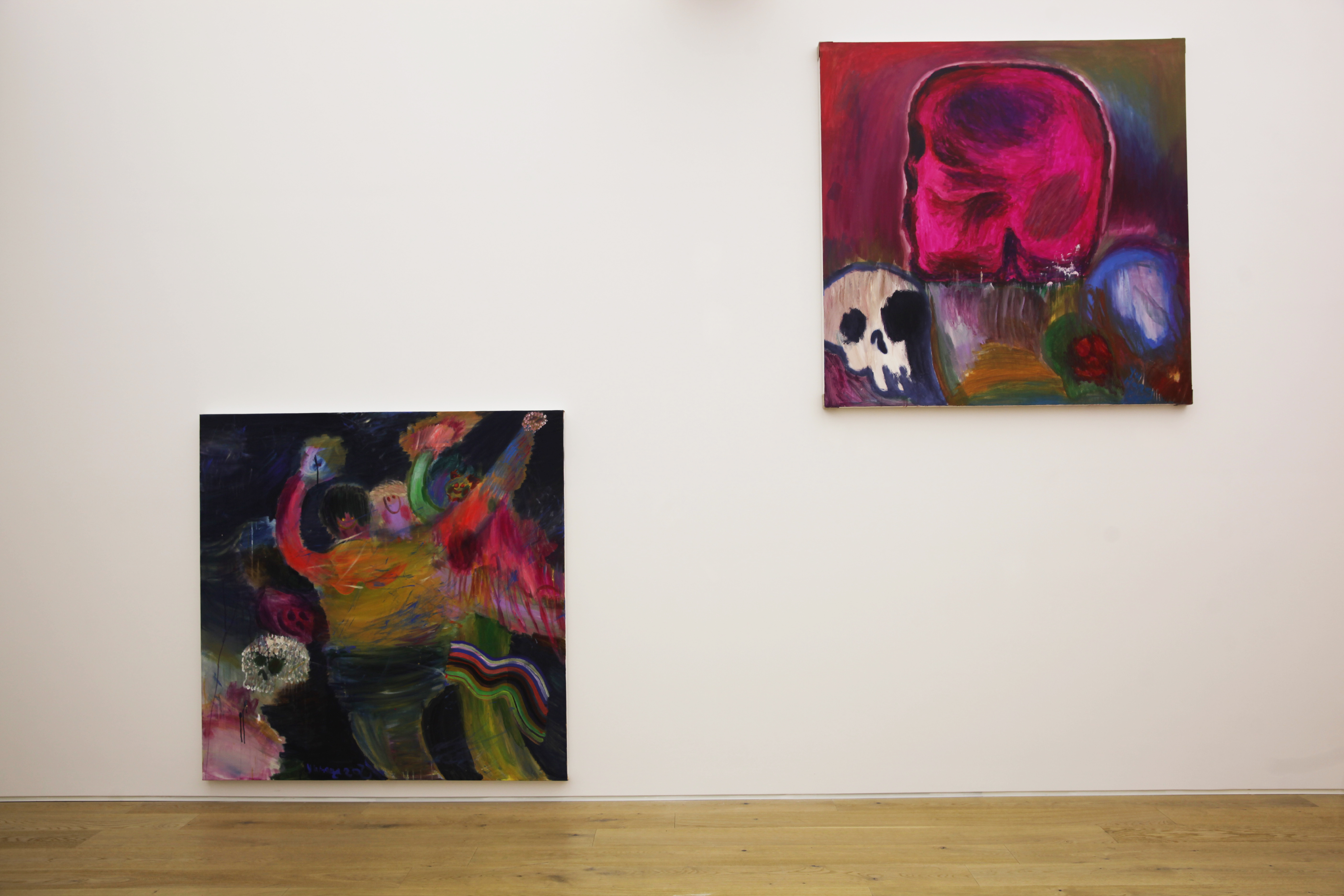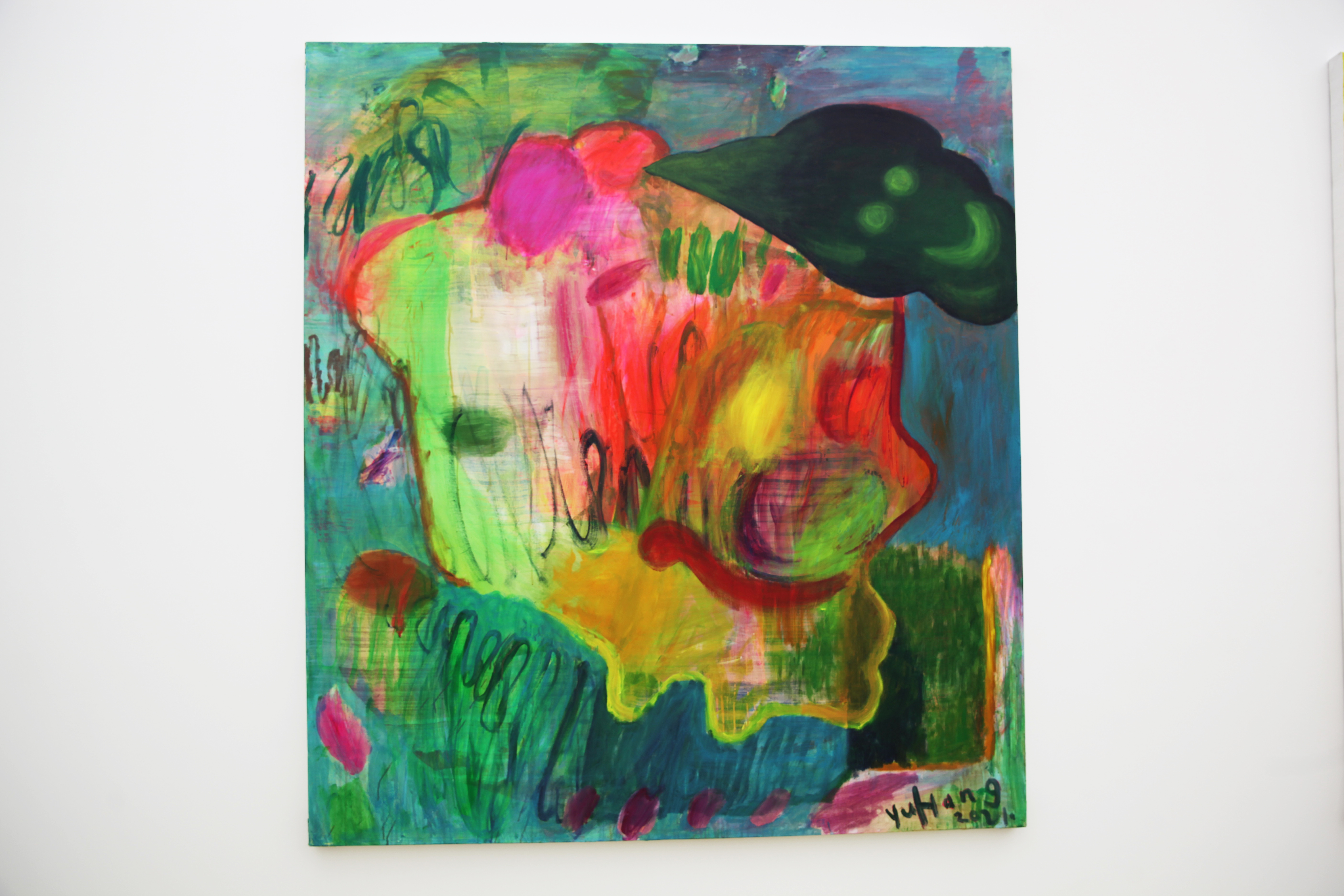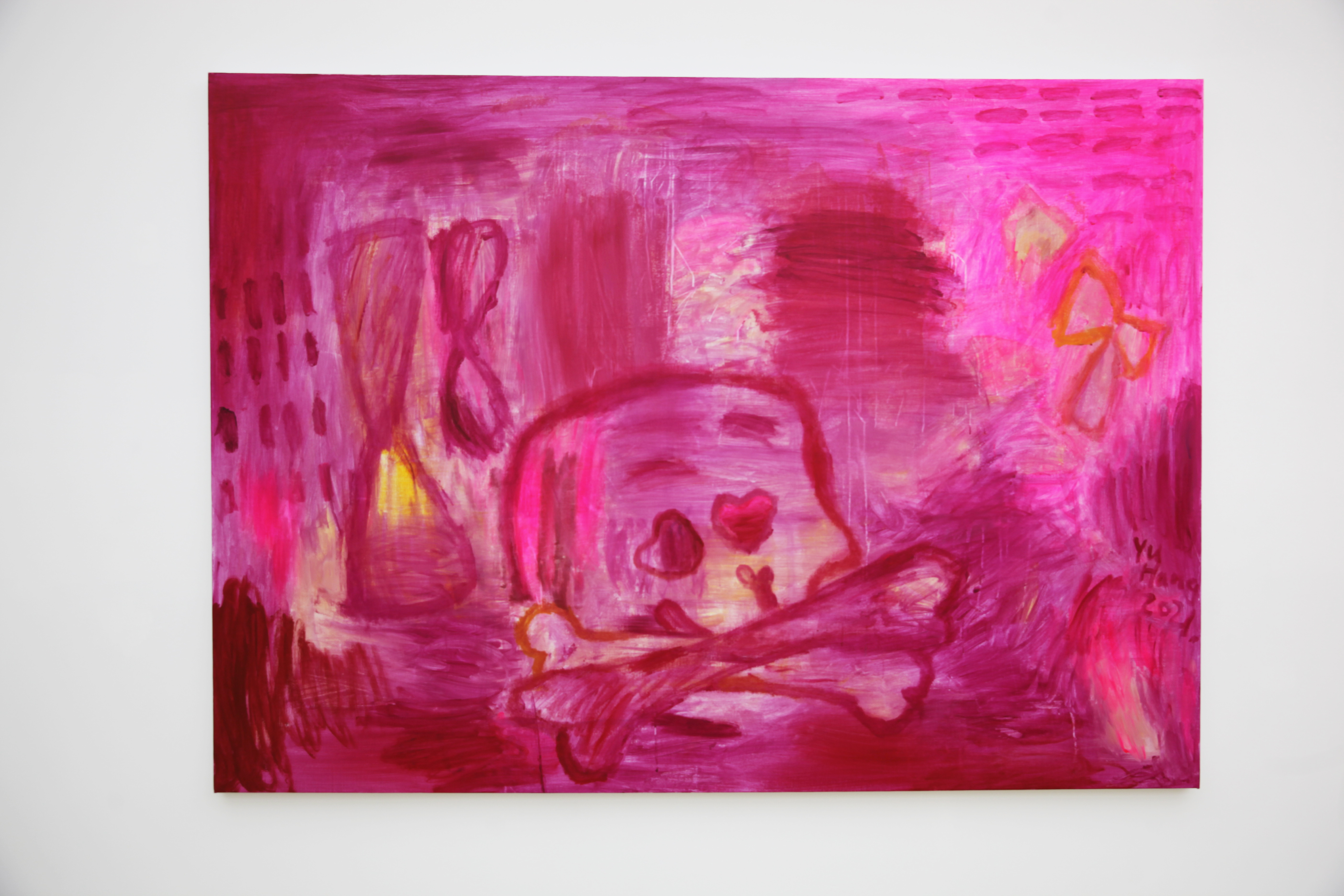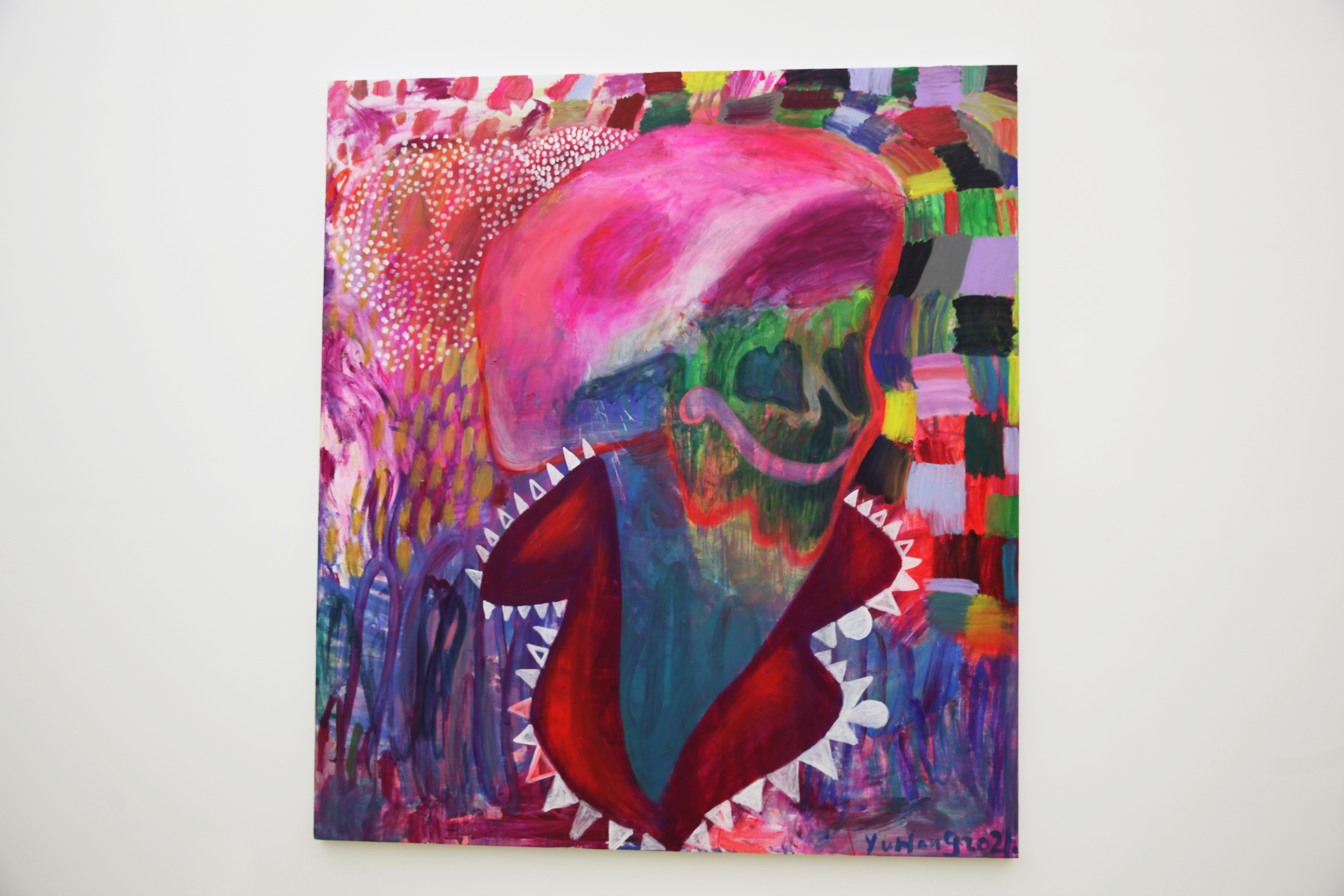 与于航2014年至2018年间创作的作品相比,本次展览的十件大型丙烯作品从色彩运用和绘画笔触等方面上均有突破。艺术家一改早期因使用深色而形成的类壁画的视觉效果,转而大量施以明黄、亮粉、天蓝等极高饱和度的颜色。这些明亮绚丽色彩的对撞不仅赋予作品扑面而来的视觉冲击感,而且象征着一种主观的对抗。同时,于航对笔触的运用也愈发成熟。本次展览中,他通过方向各异、疏密不同的笔触,巧妙地织就了十个独特的空间,每个空间中又蕴含着层叠多变得维度,有充满矛盾却又柔软的内心世界,也有悬崖边花瓣随风起舞的奇幻梦境。