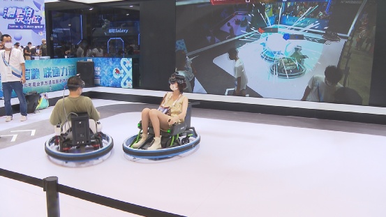 VR\AR主题展区同样是今年新增的主题展区,展区内,5G技术和MR技术碰撞出的应用使玩家得以瞬移至虚拟世界。在中国联通展台,玩家戴上MR头盔后,便能进入一个真实叠加虚拟的混合现实世界之中,享受边开车边战斗的乐趣。一位玩家从游戏车上下来后直呼过瘾:“能看到一个比较大的靶心,然后直冲你过来的,比较真实,就感觉未来的世界真的是属于虚拟技术的。”