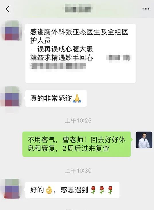 出院后,曹女士给张亚杰医生发来信息——“一误再误成心腹大患,精益求精遇妙手回春”,由衷地表达了谢意,她说,“我没有想到手术会切除得这么干净,恢复得这么快,而且我也没有出现声音嘶哑等并发症,我可以重回讲台,继续教书育人。”
