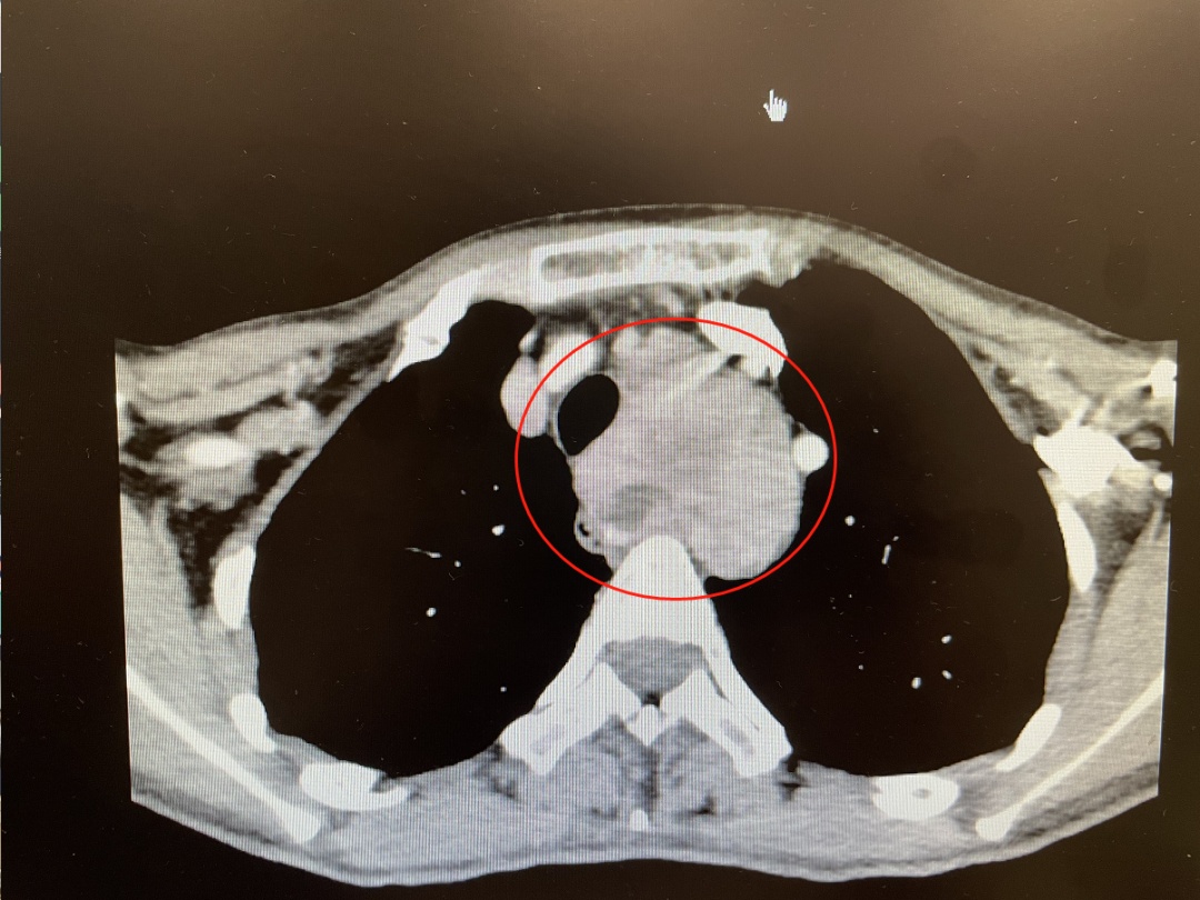 倒计时响起了,胸骨后肿物不断增大,曹女士开始有了胸闷、吞咽困难等不适症状,辗转多地检查就诊,均被告知手术复杂、创伤大,肿瘤残余等风险。经病友介绍,曹女士来到瑞金医院胸外科张亚杰医生处就诊,颈胸部CT检查显示中纵隔混杂密度团块影,长径达11cm,气管与食管受压明显,病灶上缘与左侧甲状腺下级分届不清,张亚杰医生认为曹女士的这个中纵隔占位,很可能来源于甲状腺。