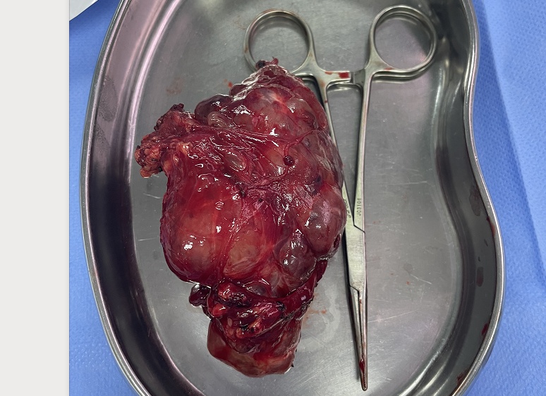 在完善手术前准备后,一场接力手术治疗开始了。手术第一步,由甲状腺外科的匡洁医生进行双侧甲状腺切除。患者有两次甲状腺手术史,手术区域粘连明显,匡医生小心分离切除双侧残余的甲状腺,并注意保护颈部重要的血管、神经。术中发现患者纵隔肿物损然起源于左侧甲状腺下级,但仅有少量组织相连,几乎所有肿瘤组织均在胸骨后中纵隔,无法从颈部拉出。