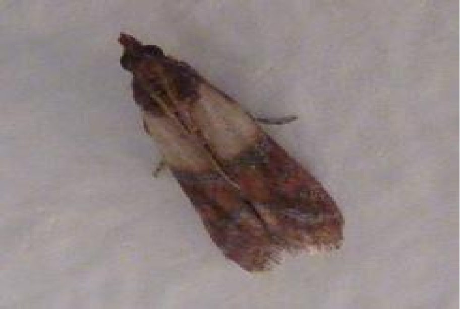 小型蛾子,体长5-9mm,翅展13-1mm。头部灰褐色,腹部灰白色。前翅细长,基半部黄白色,其余部分亮赤褐色,并散生黑色斑纹,后翅灰白色。幼虫为害各种粮食和加工品,其中以禾谷类和豆类等受害最重。对人体无害。