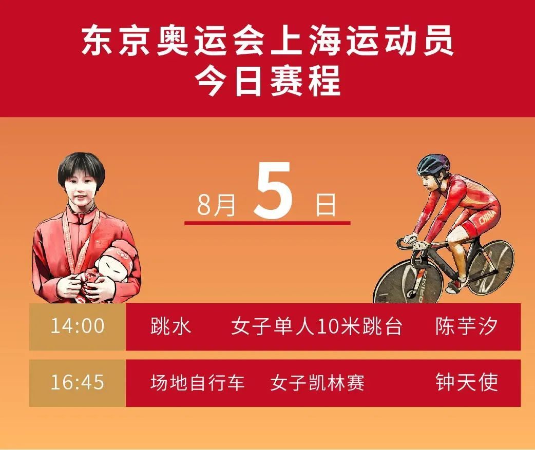 上海小将陈芋汐参加女子10米跳台决赛,中国跳水队有望再添一金。钟天使将在场地自行车女子凯林赛项目中为夺冠努力。