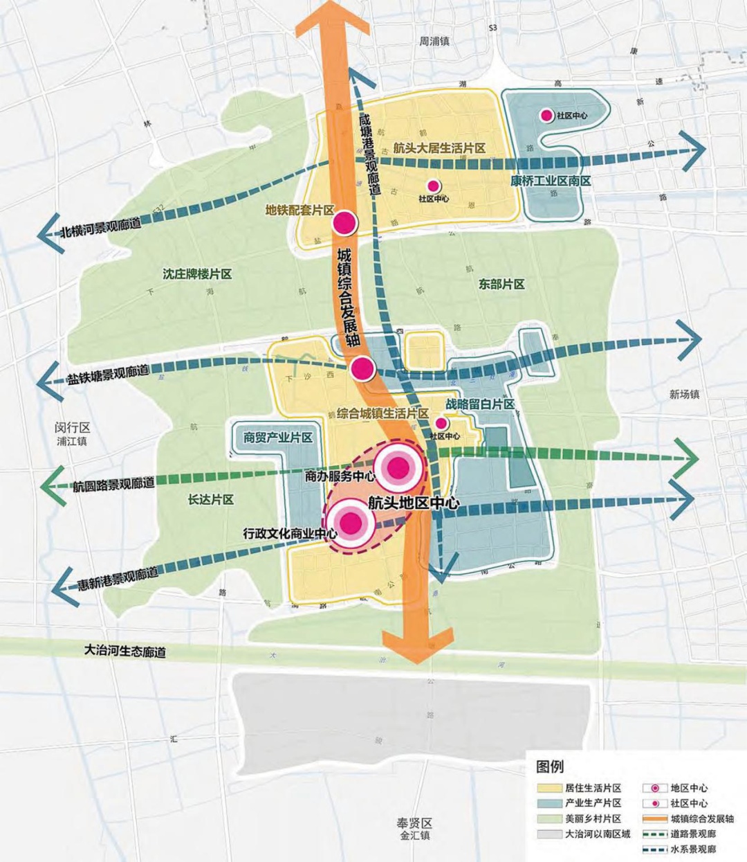 一轴统领:沿沪南公路形成城镇综合发展轴,承载公共服务、形象景观、交通联系等多重功能;强化轨道交通站点区域的功能集聚,引领航头镇的形象塑造和景观风貌。