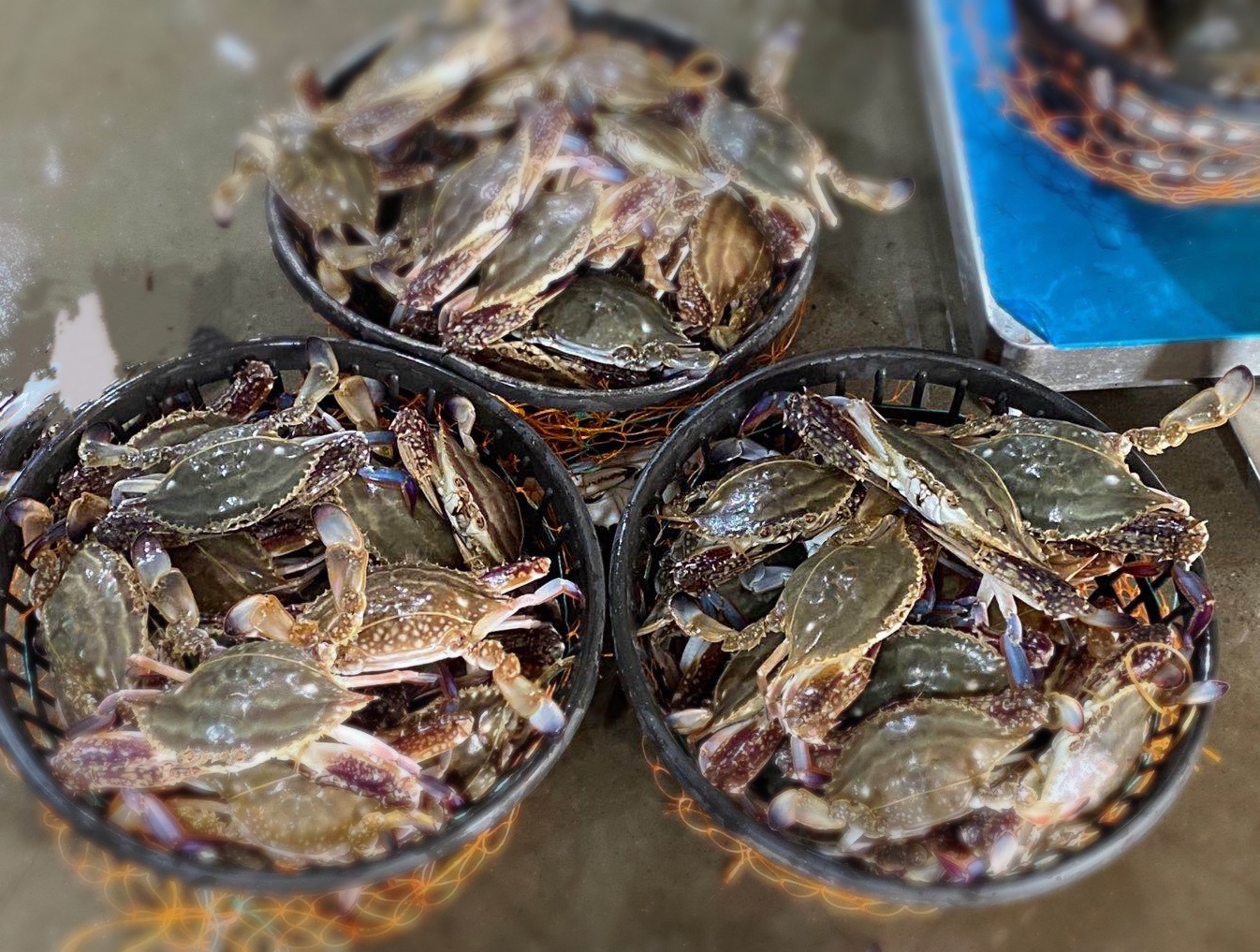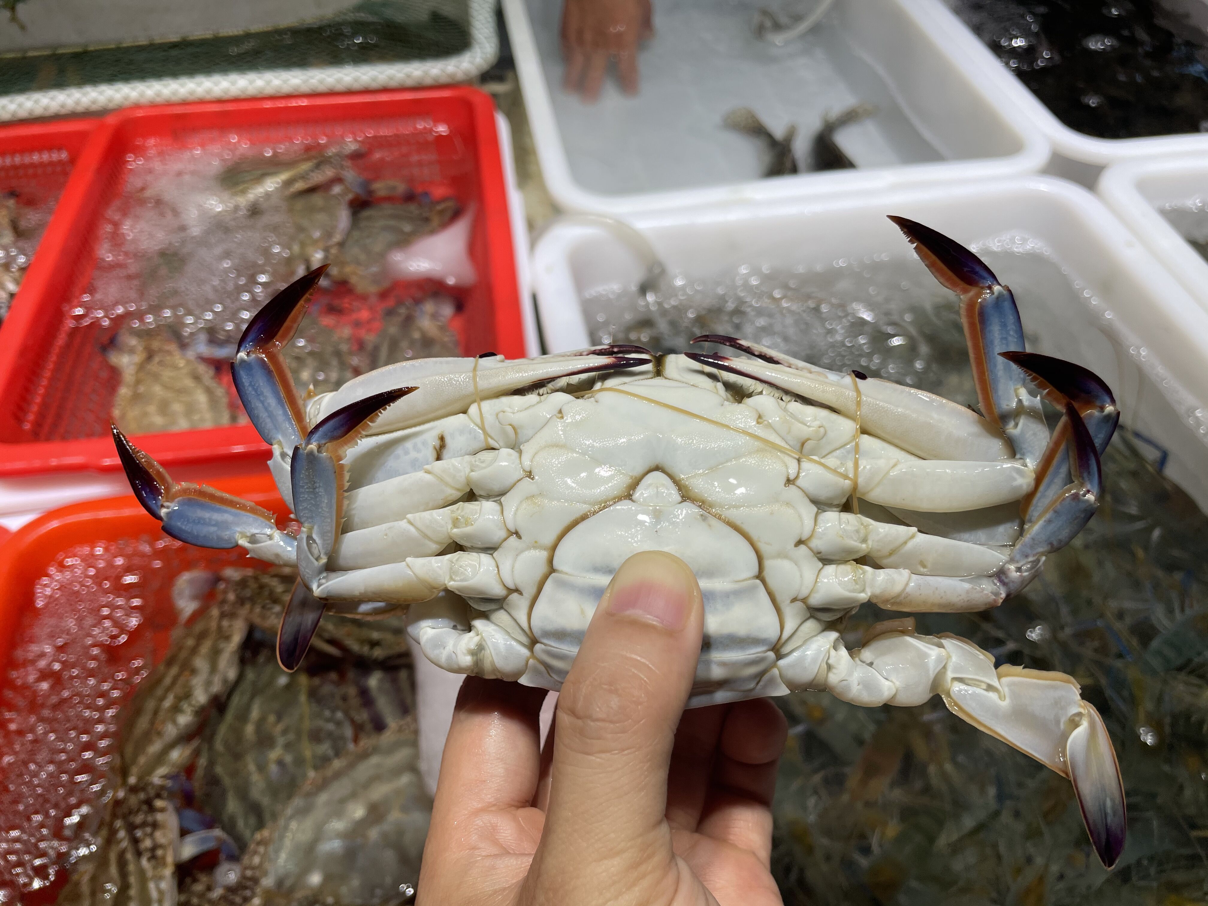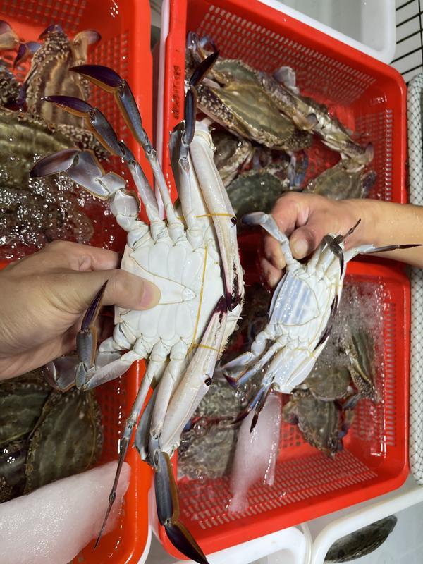 2.看颜色和纹路:蟹壳要青、蟹腹要白,不能发黑;蟹尾部要发红或发黄,并且高高翘起,证明蟹黄(膏)很满。还有个小秘密:看小腿和蟹盖连接处是不是饱满分离,分开越大越肥美。仔细观察蟹的白面纹路,纹路越深,梭子蟹越肥美。