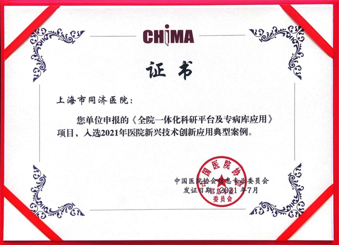 近日,中国医院协会信息专业委员会(CHIMA)公布了2021年医院新兴技术创新应用典型案例。上海市同济医院的全院一体化科研平台及专病库应用在全国212项案例中脱颖而出,成功获选21篇典型案例大名单。
