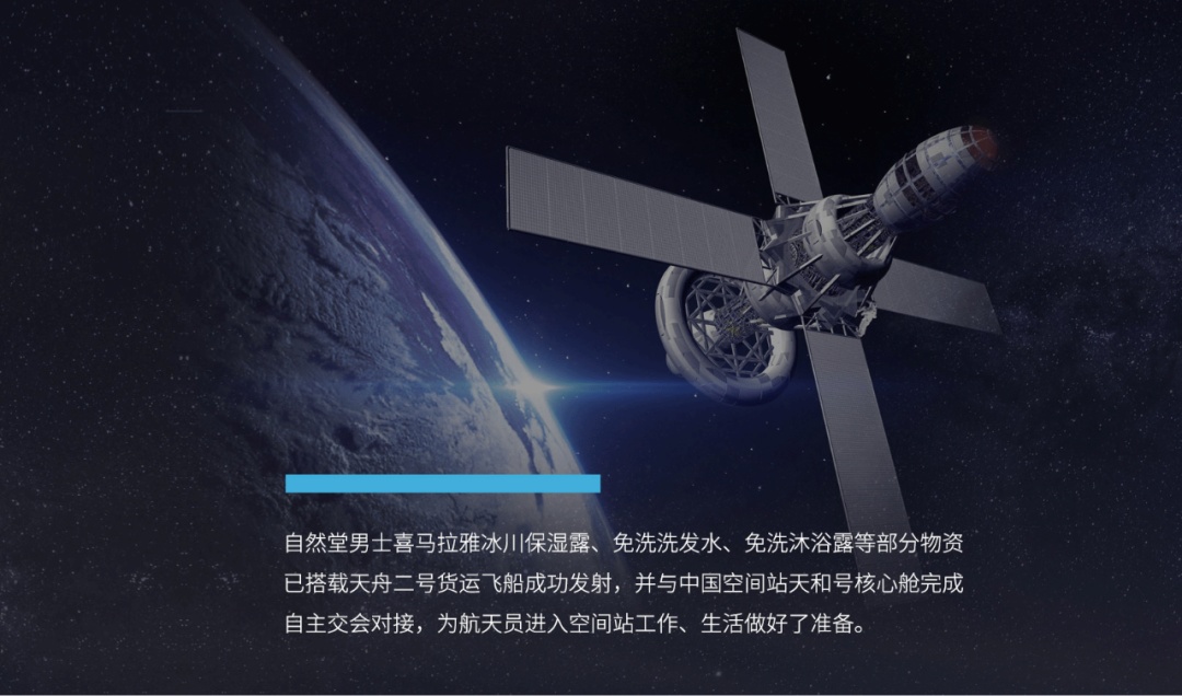 此次,伽蓝集团研发生产了6款清洁用品和11款护肤用品,包括自然堂男士喜马拉雅冰川保湿露、免洗洗发液、免洗沐浴露、免洗湿巾等。在5月29日,这些物资图全部搭载天舟二号货运飞船成功发射,并与中国空间站天和核心舱完成自主交会对接,提前为航天员进入空间站工作、生活做好了准备。