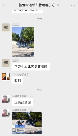 管理好共享单车,不仅需要科技手段,也需要多方合力,变被动式清理为主动监管和事前预防。在“单车管理微信群”里,记者看到成员包括各楼宇物业、单车运营企业和新虹城运中心工作人员,从之前的单方"作战"变为多方组团联合治理。