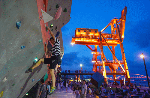 夜幕降临,最热闹的还是徐汇滨江的亲水平台,塔吊被橘黄色灯光勾勒出整体轮廓,让黄浦江畔碧蓝的夜空多了一丝璀璨灯火。攀岩墙上各种照明星星点点,吸引了周边的小朋友纷纷上墙一试身手。各种灯光造型不仅提升了景观形象,也让上海这座不夜城的特色更为突出。