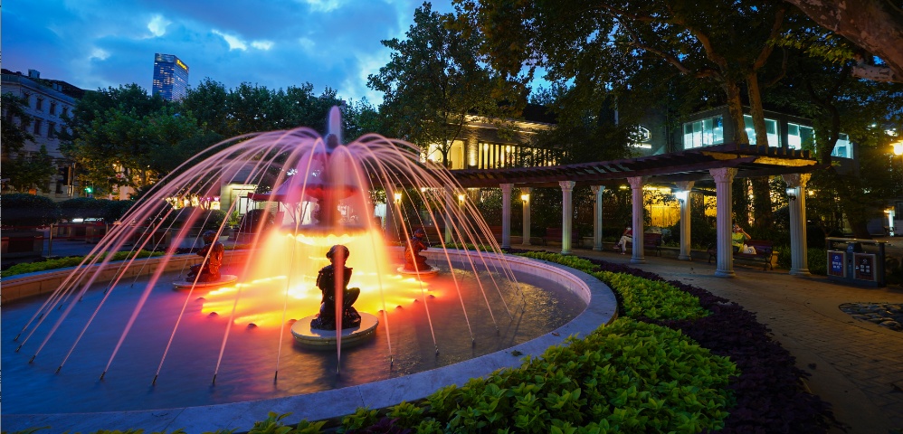 其实,徐汇区夜晚开放公共绿地也非常受大家的欢迎。在襄阳公园,林荫大道的两侧,成片的金黄色麦穗煞是惹眼,微风拂过,麦穗随风摇摆像是在欢迎前来公园的游客。公园喷泉中央安装了彩灯,水映光影,分外灵动。