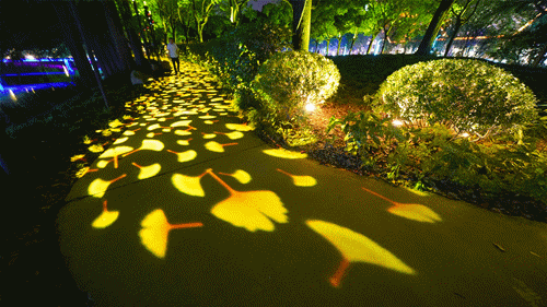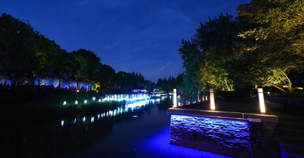 华泾公园亮灯工程对园内的景观绿化、廊桥亭台等多种元素进行艺术化亮灯。廊架灯光雕塑、弓形庭院灯、纺梭草坪灯等定制化灯光,体现了浓郁的黄道婆文化元素;南北广场、园路小径的地面投影,让市民感受到沉浸式体验;河道两侧的造雾系统配合仿生植物灯光,使得夜晚的华泾公园恍如仙境。
