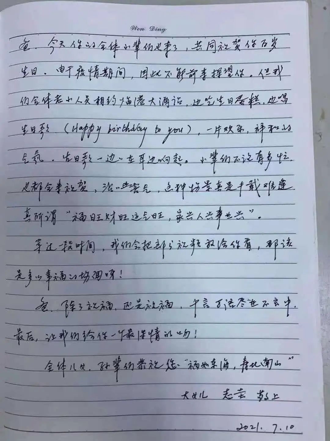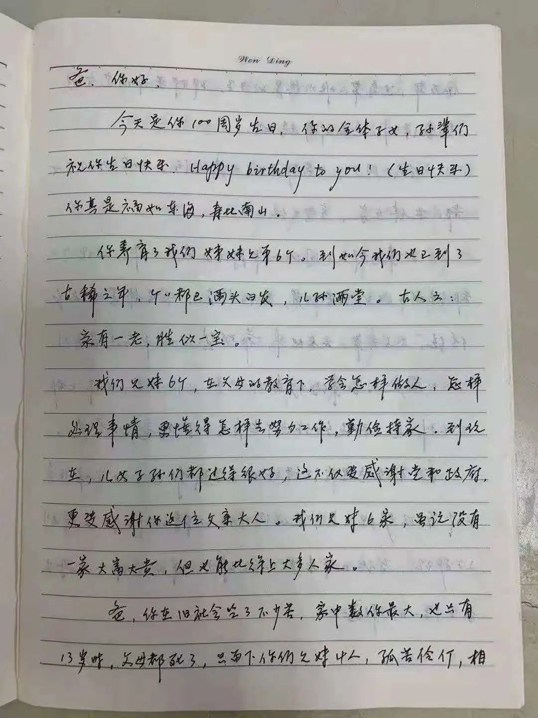 “爸,你好!今天是你100岁生日。你的全体子女、孙辈们,祝你生日快乐!家有一老,胜似一宝。我们兄妹六个,在父母的教育下,学会怎样做人,怎样处理事情,更懂得怎样去努力工作,勤俭持家。孙辈们都在不同的工作岗位上努力工作,都继承了你吃苦耐劳、勤俭持家、艰苦朴素的优良传统……”
