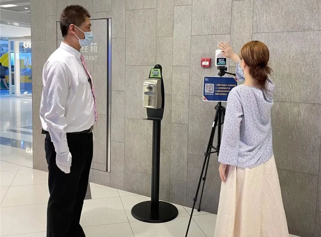 “你好!请戴好口罩,配合测温并出示健康码!”在虹桥南丰城入口处,保安正对入场顾客进行提醒。为持续抓好“防疫三件套”管理工作,商场首层主入口均张贴有防疫提示,配置测温设备及免洗洗手液。对于没有智能手机或没带手机的顾客,安排工作人员现场登记信息。