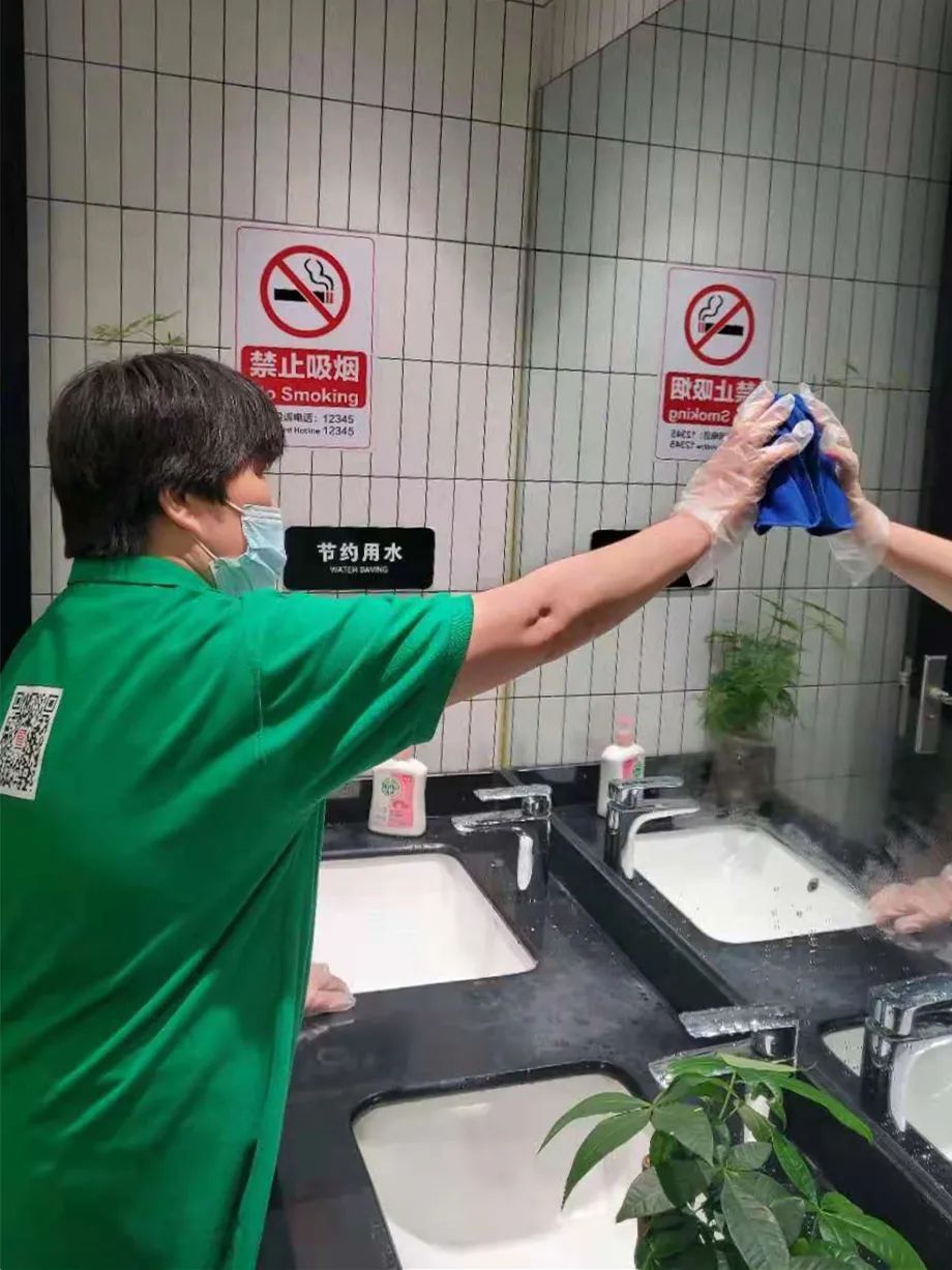 商场客服台设置有“一米线”,提醒消费者保持安全距离,并配置备用口罩、消毒纸巾、消毒剂、医疗应急箱等防疫物资。通风系统方面,商场对中央空调系统每日消毒并加强空调通风。公共空间消毒方面,已加强全场卫生和消毒措施,提高消毒频次。