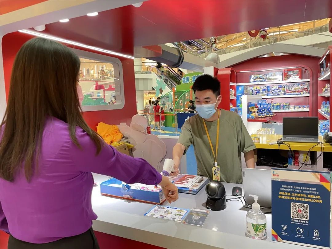商场内部正在举行的主题IP展览等活动区域已升级防疫要求,若参与商场中庭活动需预约入场,全程佩戴口罩,保持社交距离,游玩前后需使用免洗洗手液。