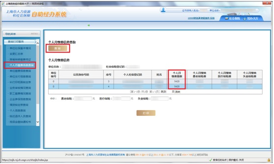 展开左侧导航栏,点击“个人月缴费信息查询”,再点击“查询”,即可显示单位员工月缴费基数等明细信息。