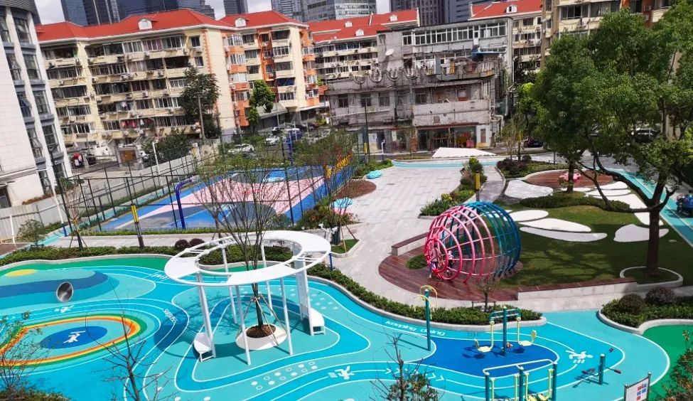 绿地西侧则是一个标准篮球场,配有灯光。造型有趣、色彩明快的蛋壳廊架、3米高的庭院灯等设施,既有实用功能,也起到了装饰作用。
