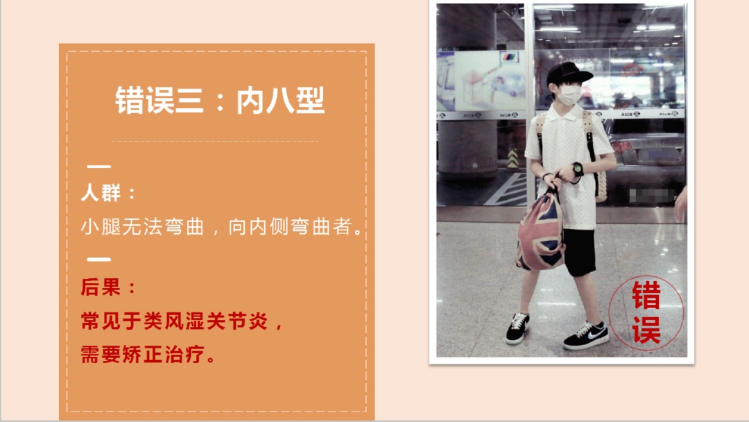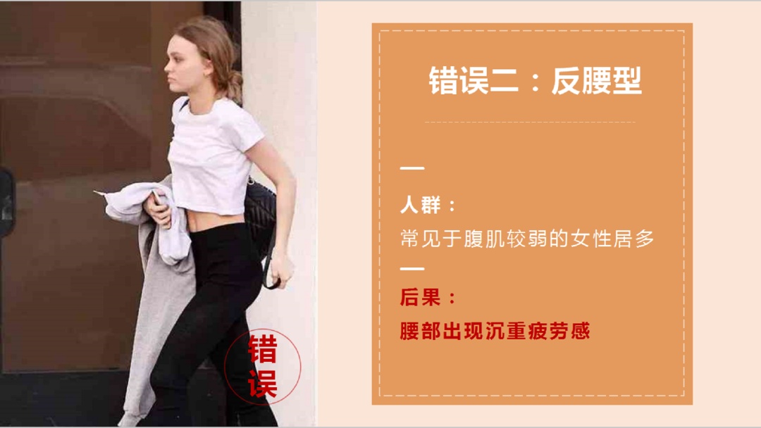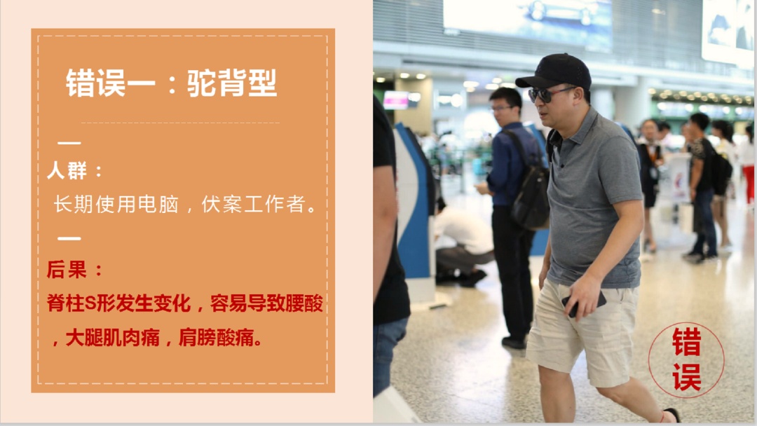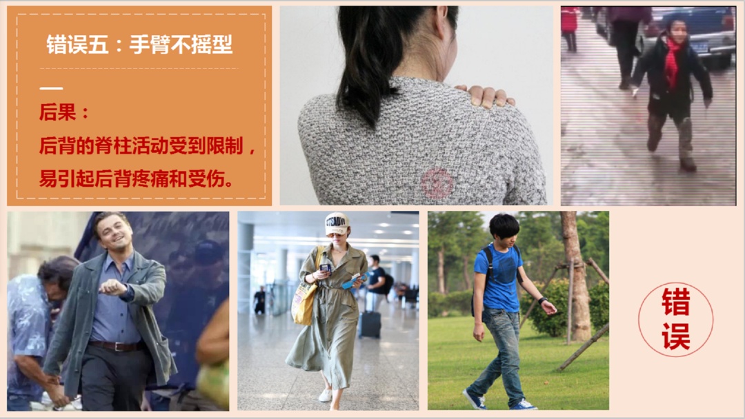 陆秋霞:一是驼背型,二是反腰型,一般女性群体比较多见,有腰部沉重疲劳感。三是内八字,四是外八字,五是手臂不摇,背部脊柱活动受限,引起背部疼痛甚至受伤。这些都是错误的走路姿势。