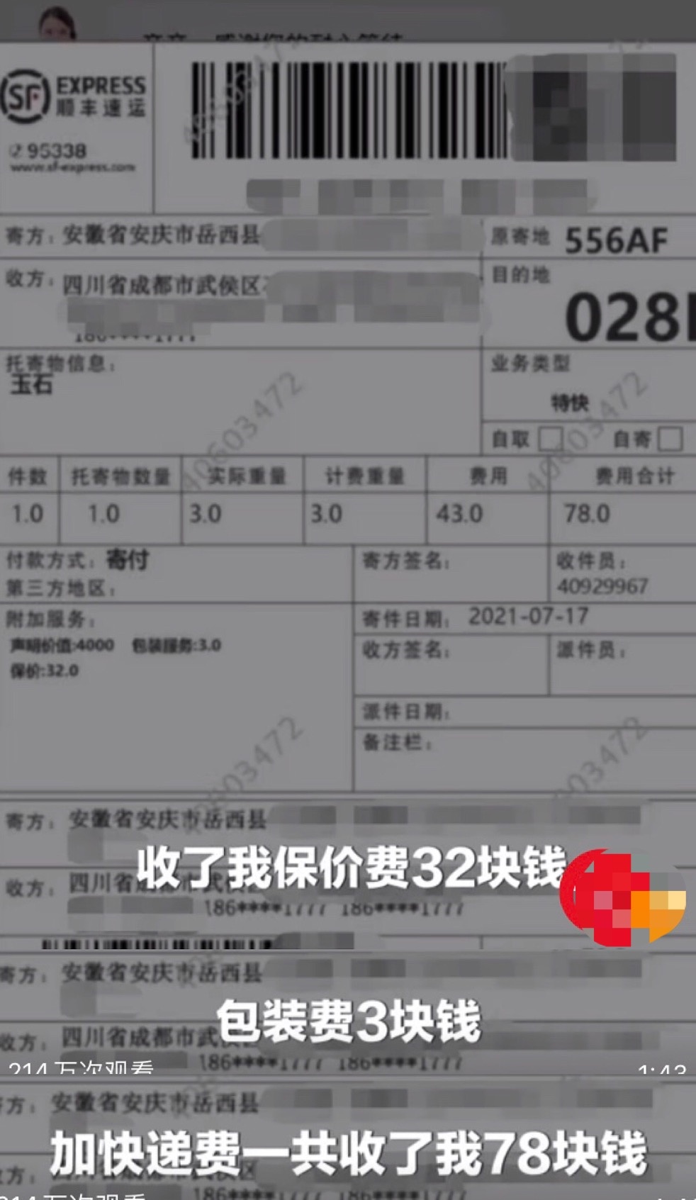 快递人员上门检查货物之后,开了声明价值4000,保价32元的物流单,再加上包装费和运费,快递员共收取了78块钱。